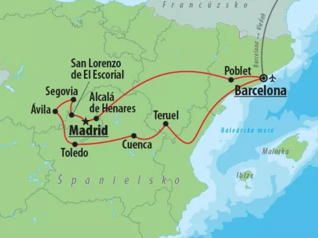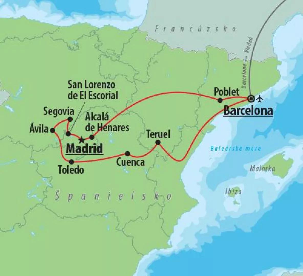 2. deň: Raňajky, odchod ku kláštoru Santa Maria de Poblet (UNESCO), prehliadka historického centra Alcalá de Henares (UNESCO), vrátane arcibiskupského paláca a rodného domu Miguela de Cervantesa. Ubytovanie a večera.