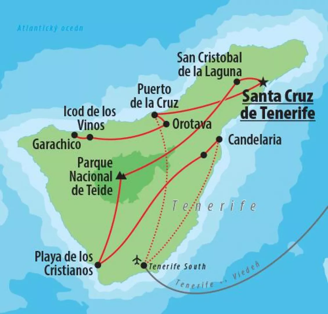 Počas zájazdu je poskytnutá letecká doprava z Viedne na Tenerife a späť, pričom sú zabezpečené aj všetky transfery medzi letiskom a hotelom. Na okruhu je k dispozícii autokarová doprava.