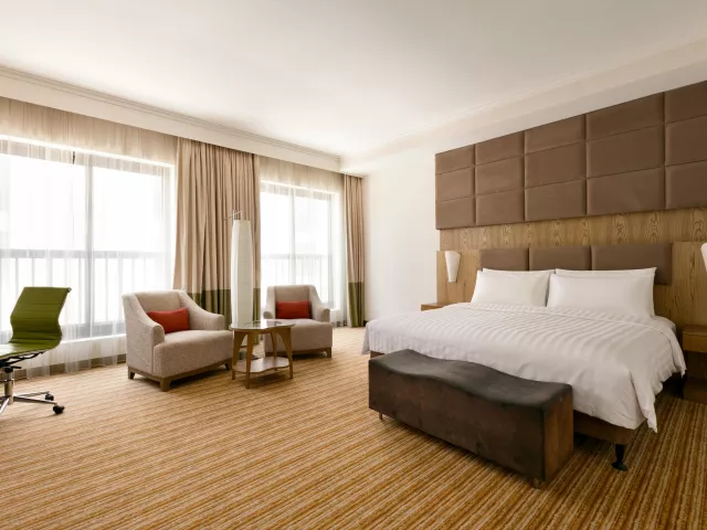 Dvojlôžková izba, superior: kúpeľňa/WC (sušič vlasov), klimatizácia, LCD TV/sat., DVD prehrávač, telefón, set na prípravu kávy a čaju, minibar za poplatok, Wifi, žehlička a žehliaca doska, trezor, 32m2, výhľad na mesto Ostatné typy izieb (pokiaľ nie je uvedené inak, majú izby vyššie uvedené vybavenie) Dvojlôžková izba, deluxe: priestrannejšia - 48m2. Dvojlôžková izba, premier: priestrannejšie - 52m2 Pri izbe Superior v prípade obsadenosti 2+1, dieťa zdieľa posteľ s rodičmi. Prístelka nie je možná. Pri izbách Deluxe a Premier k dispozícii jedna prístelka, v prípade obsadenosti 2+2 zdieľa druhé dieťa posteľ s rodičmi.