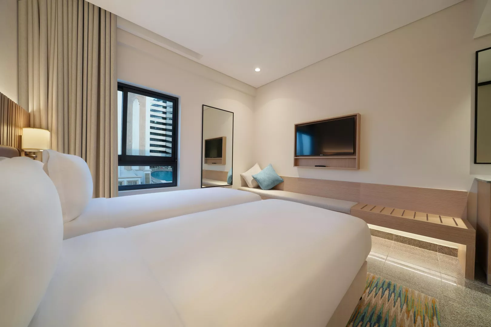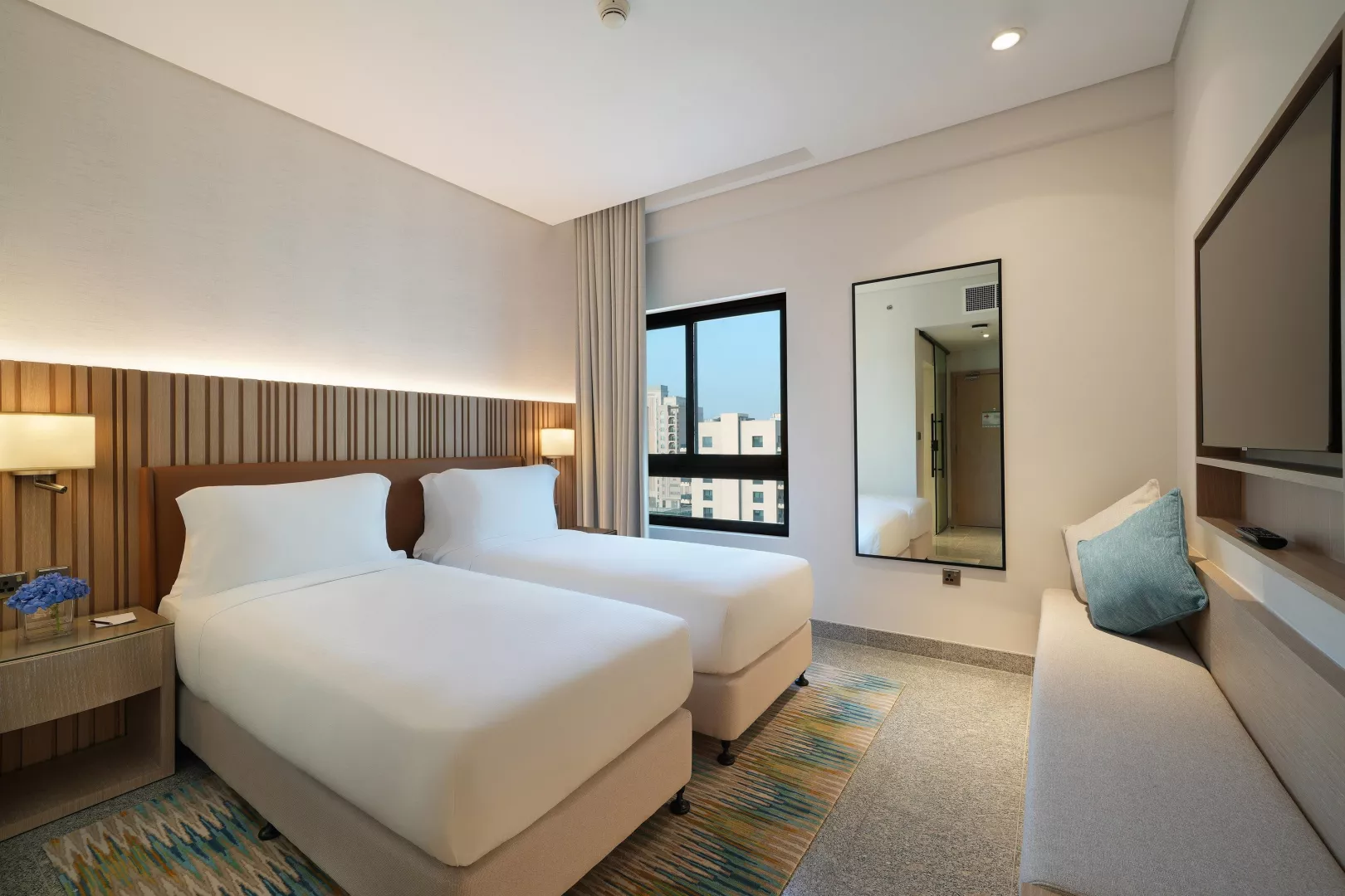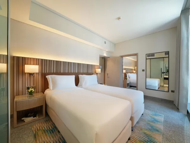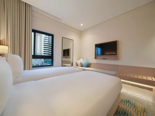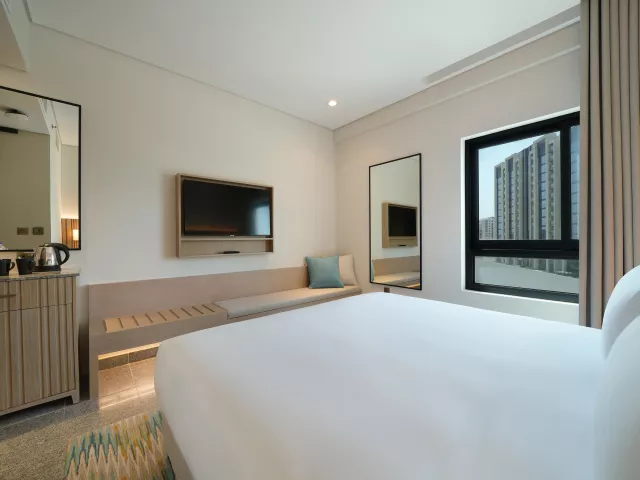Dvojlôžková izba, Výhľad Mesto: klimatizácia, kúpeľňa/WC, Fén, TV, telefón, trezor, set na prípravu kávy a čaju, Wifi, výhľad na mesto, jedna posteľ veľkosti King, izba má 20m2. Ostatné typy izieb (pokiaľ nie je uvedené inak, majú izby vyššie uvedené vybavenie) Dvojlôžková izba, Výhľad Bazén: výhľad na bazén Dvojlôžková izba, Guest, King: priestrannejšia izba - 35m2, balkón, výhľad na mesto alebo na bazén, posteľ veľkosti King Pri izbe výhľad mesto a výhľad bazén nie je prístelka možná, v prípade obsadenosti 2 +1 dieťa zdieľa posteľ s rodičmi. Jedna prístelka možná iba pri izbe Guest, King. V prípade obsadenosti 2+2 zdieľa druhé dieťa posteľ s rodičmi.