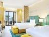 Dvojlôžková izba, guest s výhľadom na bazén: kúpeľňa/WC (sušič vlasov), klimatizácia, trezor, rádio, LCD TV/sat., set na prípravu kávy a čaju, minibar za poplatok, žehlička, balkón, výhľad na bazén, vo vzdialenejšej budove. Ostatné typy izieb (pokiaľ nie je uvedené inak, majú izby vyššie uvedené vybavenie) Dvojlôžková izba, guest, výhľad ostrov: v hlavnej budove, nižšie poschodie bez výhľadu na more. Dvojlôžková izba, guest s výhľadom na more: výhľad na more, v hlavnej budove. Dvojlôžková izba, deluxe: priestrannejšia, vo vilkách. 45 m2 Dvojlôžková izba, bay club výhľad mora: moderné izby, v bočných päťposchodových budovách, Nespresso, gauč, výhľad na more. 45 m2 Dvojlôžková izba, bay club so vstupom na pláž na prízemí: viď dvojlôžková izba bay club výhľad mora, na prízemí s priamym vstupom na pláž. 45 m2 Rodinná izba, výhľad na more: výhľad na more, v hlavnej budove, 2 prepojené izby. 45 m2 Obsadenosť izieb Dvojlôžková izba : 2 dospelí + 1 dieťa / 2 dospelí / 1 dospelý + 2 deti / 1 dospelý + 1 dieťa / 1 dospelý Dvojlôžková izba (Deluxe, Bay Club): 3 dospelí / 2 dospelí + 2 deti / 2 dospelí + 1 dieťa / 2 dospelí / 1 dospelý + 2 deti / 1 dospelý + 1 dieťa / 1 dospelý. Rodinná izba : 4 dospelí + 1 dieťa / 4 dospelí / 3 dospelí + 2 deti / 3 dospelí + 1 dieťa / 2 dospelí + 3 deti / 2 dospelí + 2 deti. Dieťa do 14 rokov V izbách dvojlôžková izba s výhľadom na bazén a na more, pri ubytovaní 2 dospelých sú k dispozícii dve twin postele/alebo jedna king, s 1 dieťaťom k dispozícii 1 posteľ typu king a 1 prístelka. V izbách typu Deluxe a BayClub je k dispozícii max. 1 prístelka. V prípade 2 detí sú k dispozícii 2 postele typu queen. V Rodinnej izbe je prístelka k dispozícii. Infant nad rámec max.obsadenosti izby je možný iba v izbách Deluxe a Bay Club.