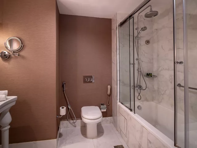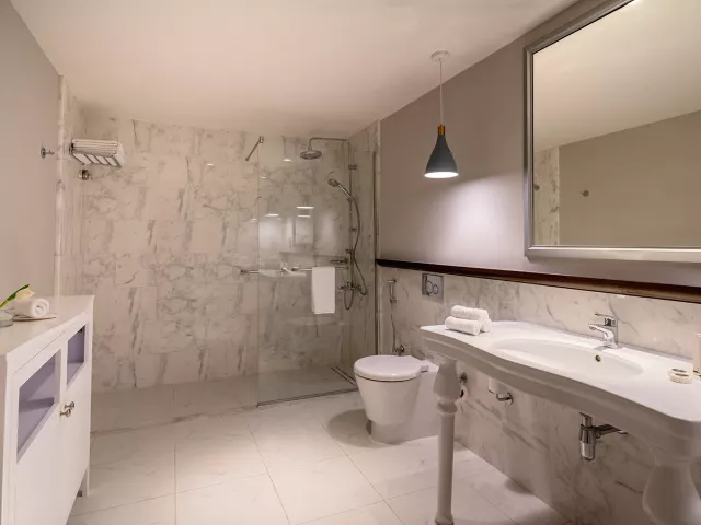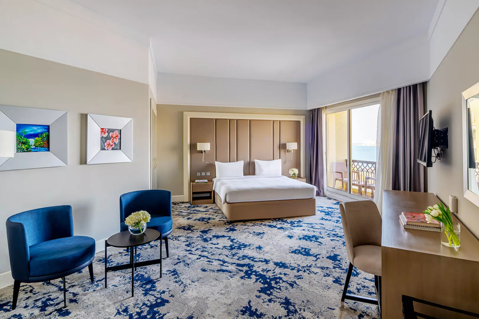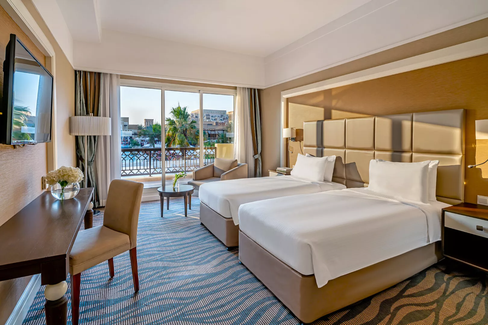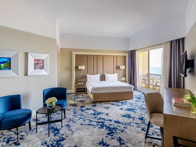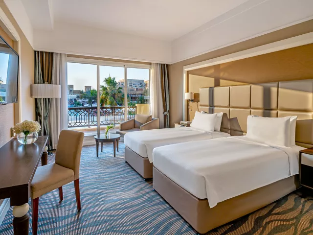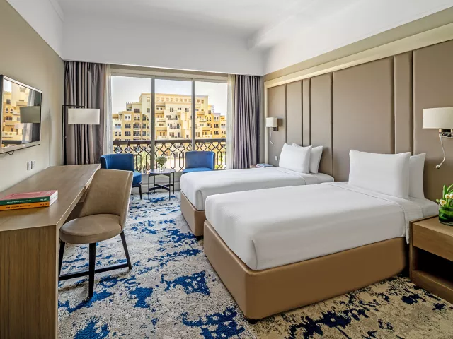 Izby sú elegantne zariadené a ponúkajú nádherný výhľad na záliv, bazén alebo na Ras Al Khaimah. Vybavenie izieb zahŕňa kúpeľňu, kúpacie plášte, pohodlné sedenie, LCD TV, minibar (denne dopĺňaný v rámci ultra all inclusive), trezor zdarma a bezplatné Wi-Fi. K dispozícii sú izby Deluxe (35 m², bez balkóna), Premium (niektoré s balkónom), rodinné izby (70 m²) a Kids Escape family suite (70 m²).