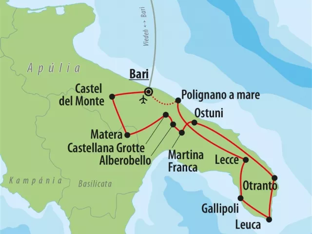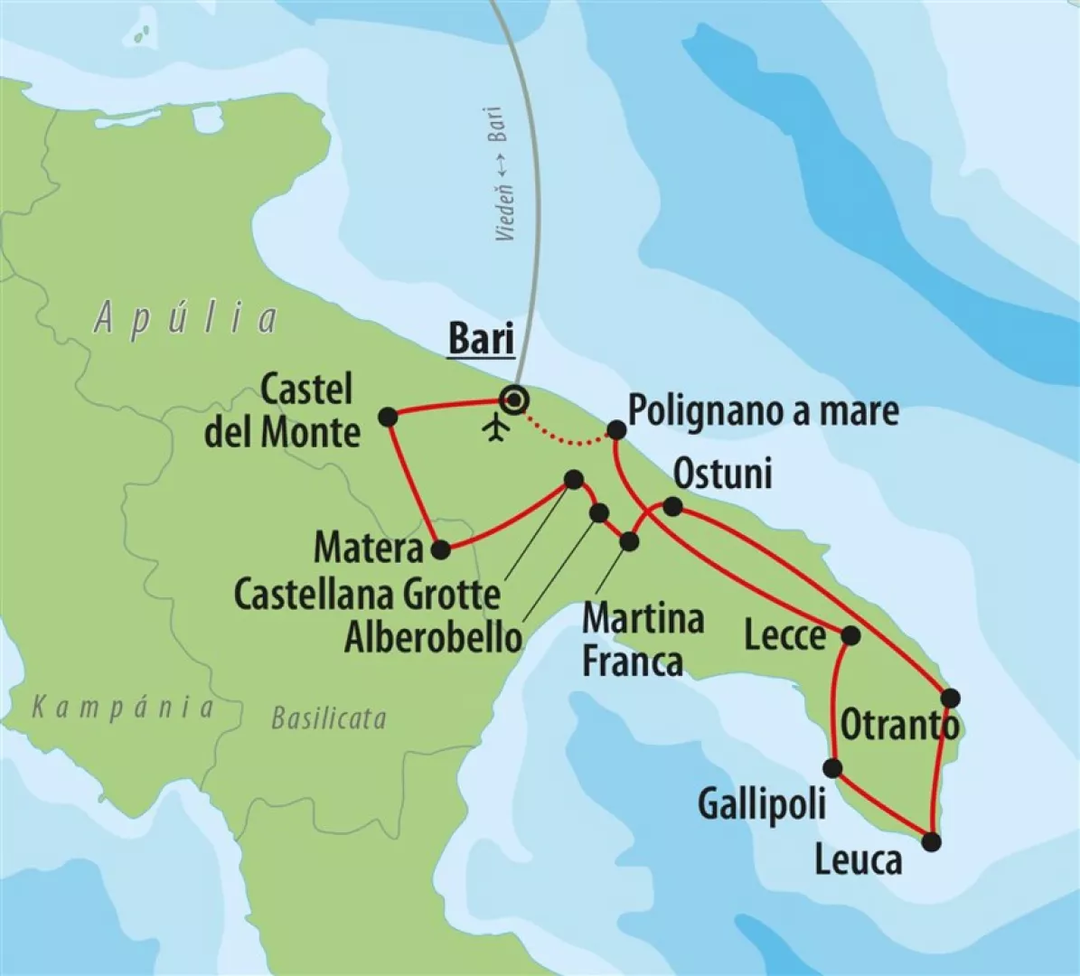 Program zahŕňa prehliadku miest ako Bari, Castellana Grotte, Castel del Monte, Altamura, Matera, Alberobello, Martina Franca, Ostuni, Otranto, Leuca, Gallipoli, Lecce a Polignano a Mare.