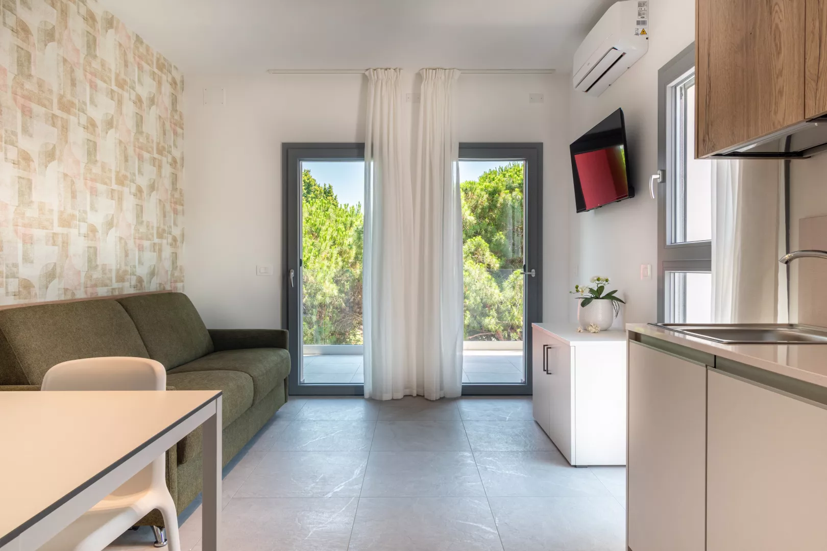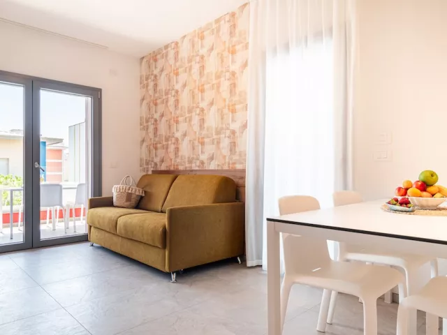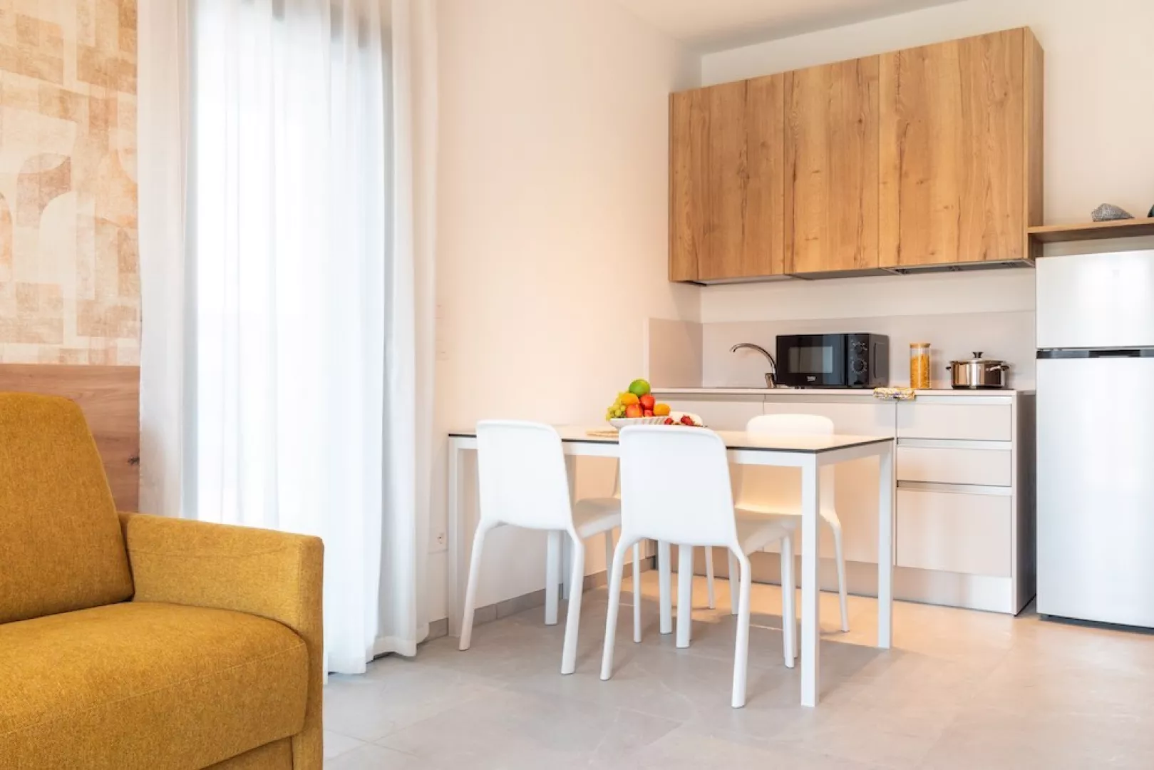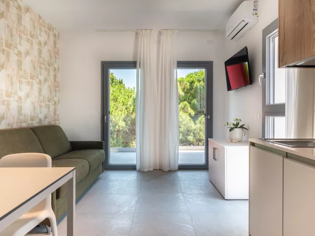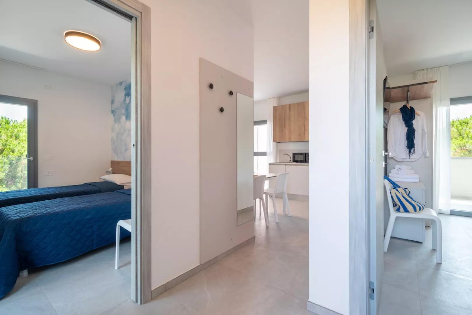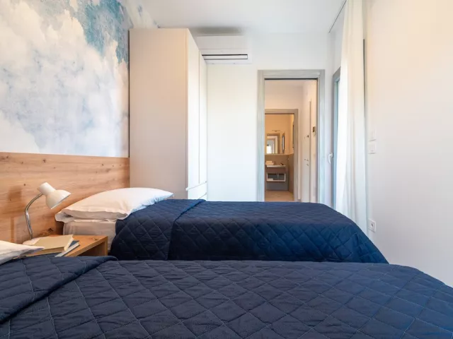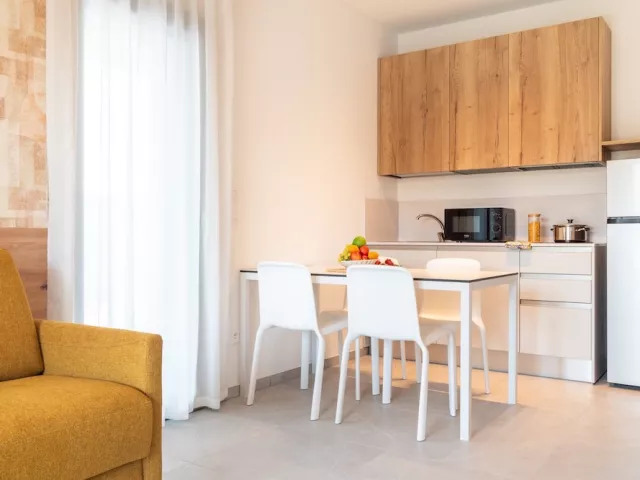 Typy apartmánov: Štúdio typ A4 pre 2-4 osoby Štúdiový apartmán pozostáva zo spálňovej časti s dvojlôžkom, v obývacej izbe s kuchynským kútom sa rozkladacia pohovka pre dve osoby, kúpelňa. Štúdio disponuje zariadeným balkónom., Apartmán typ C5+2 pre 4-7 osôb Apartmán pozostáva zo spálne s dvojlôžkovou postelou a jedným samostatným lôžkom, malá spálňa s dvomi samostatnými lôžkami. V obývacej časti s kuchnským kútom sa nachádza rozkladacia pohovka pre dve osoby, kúpelňa so sprchovým kútom. Apartmán disponuje zariadenou terasou., Vybavenie apartmánov: TV/SAT, klimatizácia, WiFi, kuchynský kút s chladničkou a mikrovlnnou rúrou, vlastné sociálne zariadenie, balkón,