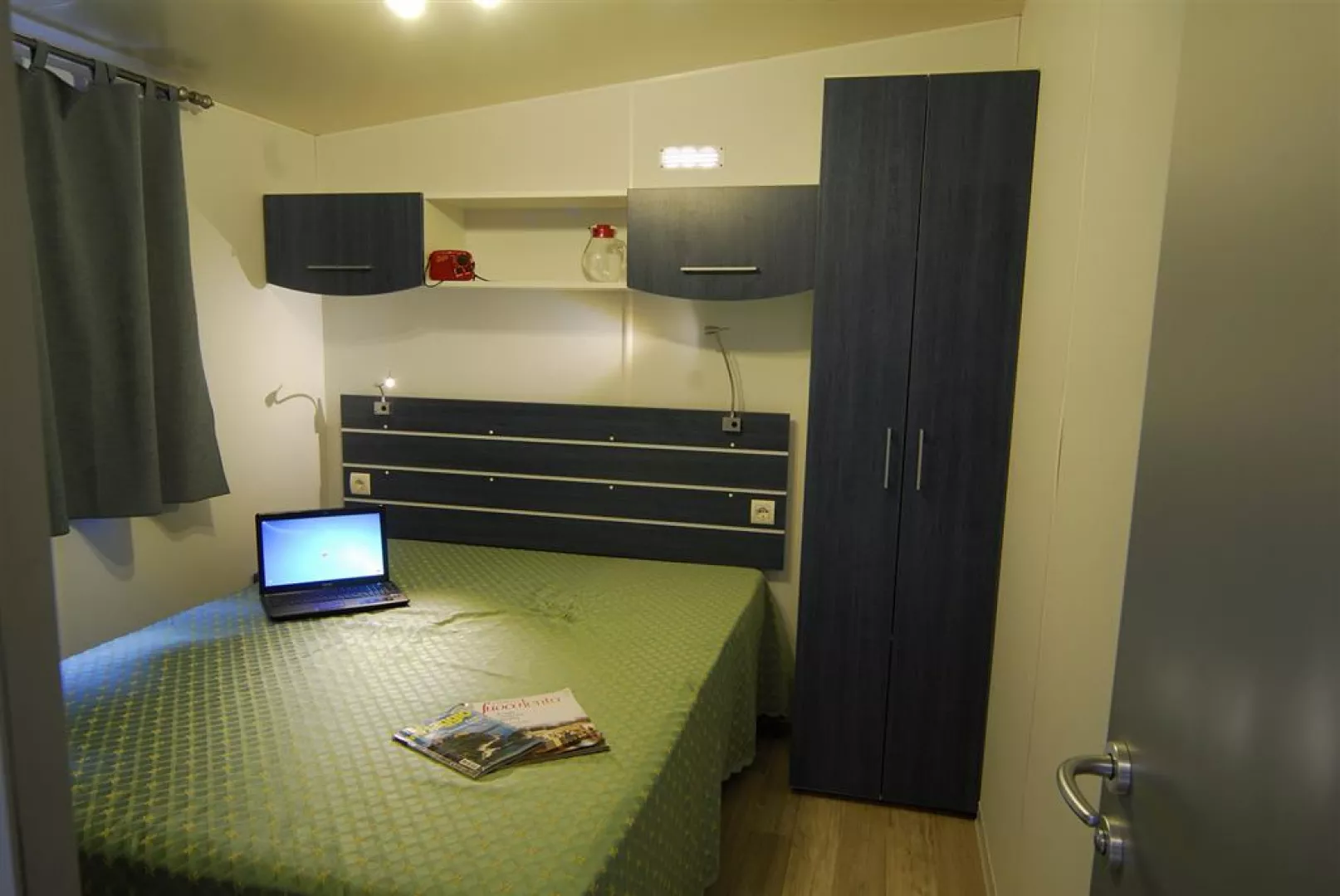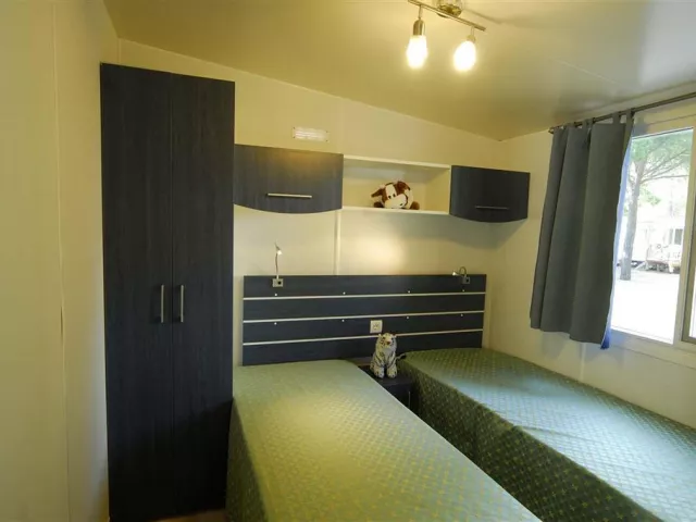 Maxikaravan Twin pre 4 osoby pozostáva z dvojlôžkovej spálne, kúpeľne, kuchynského kútu s velkým rozkladacím gaučom, vnútornej terasy.