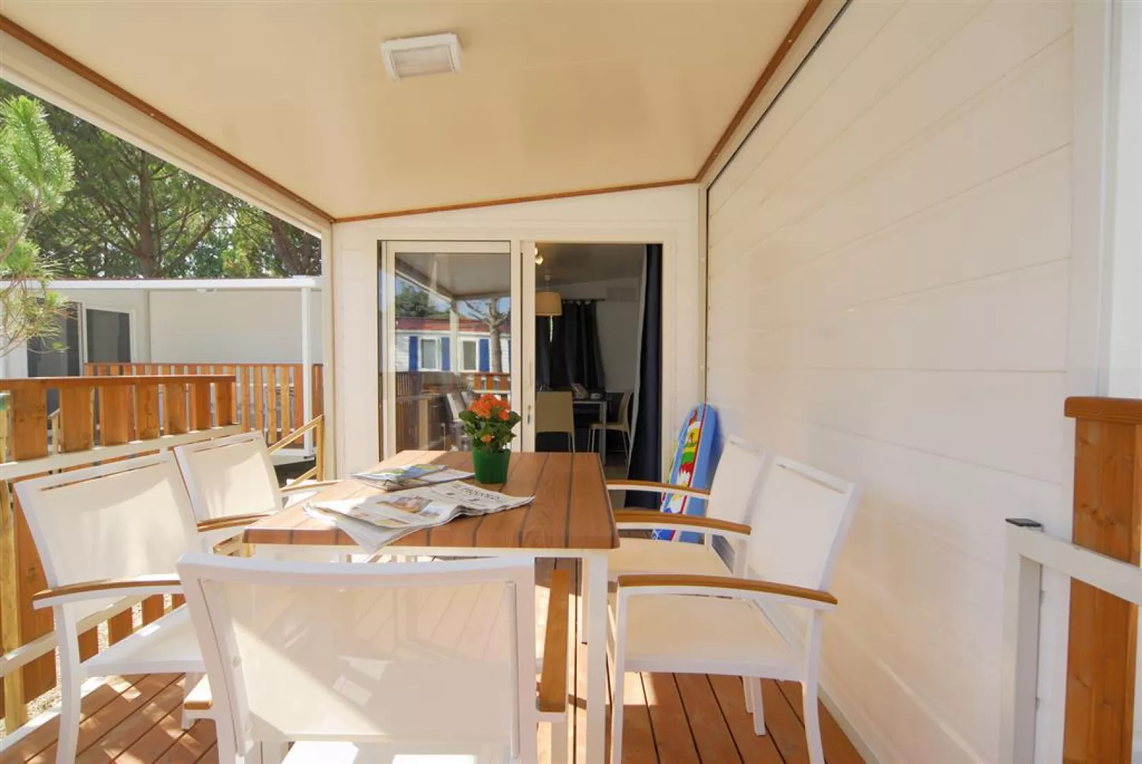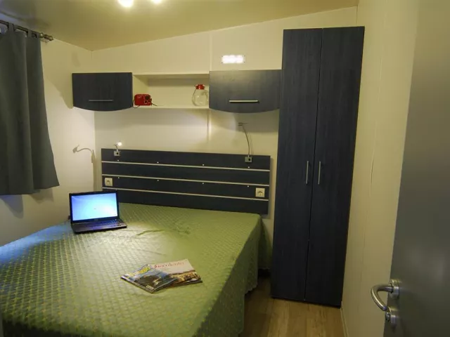 Maxikaravan Luxury pre 6 osôb pozostáva zo spálne s dvojlôžkom, kúpeľne (WC a umývadlo), dvoch spální zo samostatnými 2 lôžkami, kuchynského kútu, ďalšej kúpeľne so sprchou a verandy.