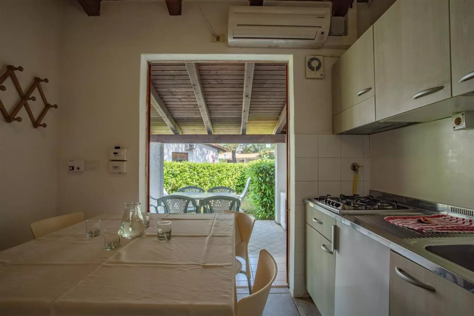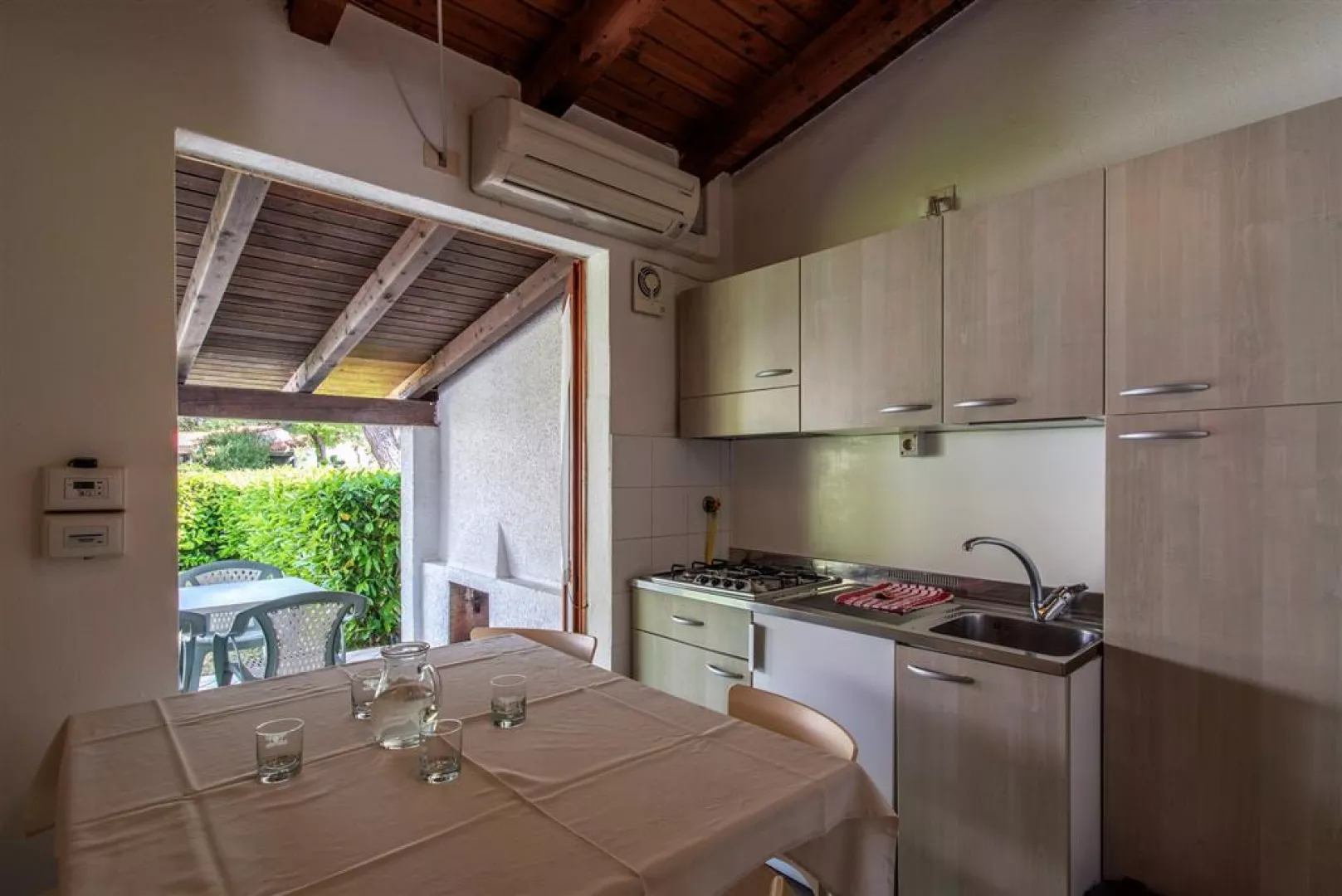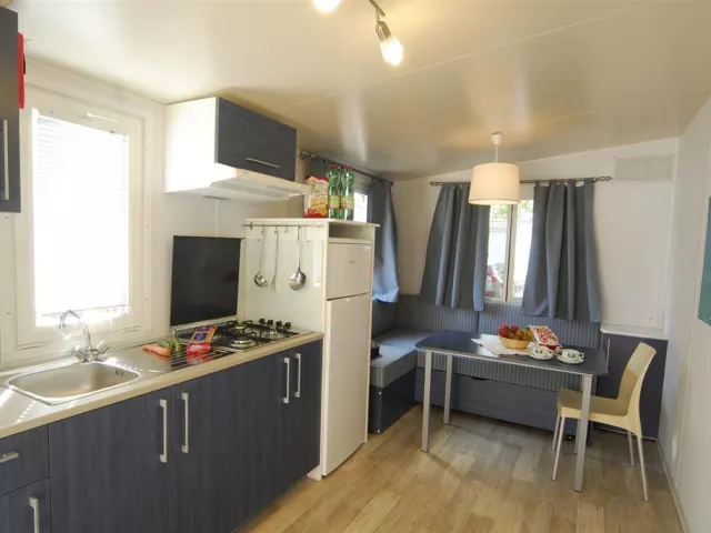 Minibungalov pre 4 osoby pozostáva zo spálne s dvojlôžkom, obývacej miestnosti s kuchynským kútom a pohovkou, kúpeľne, terasy vybavenej nábytkom.