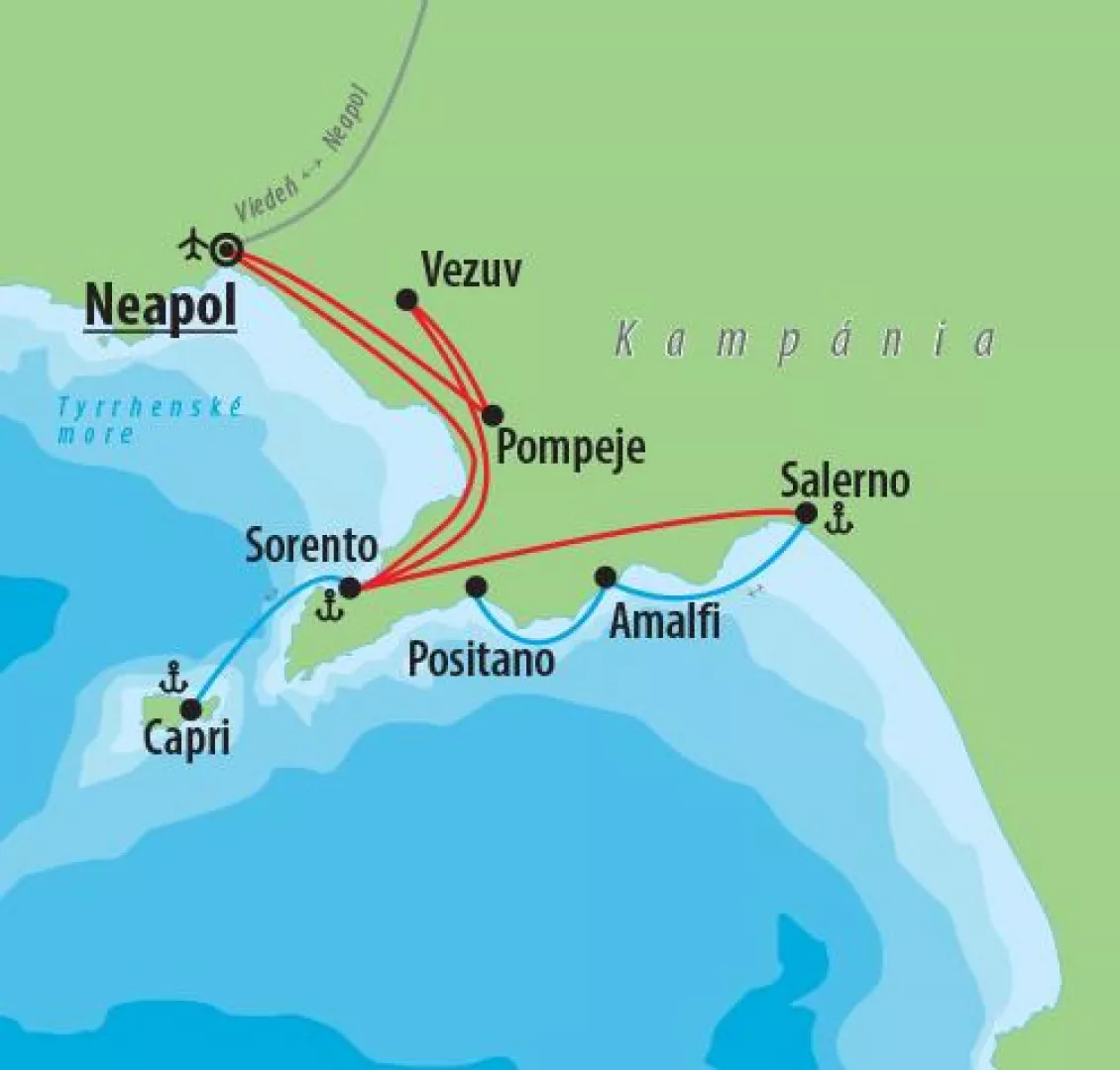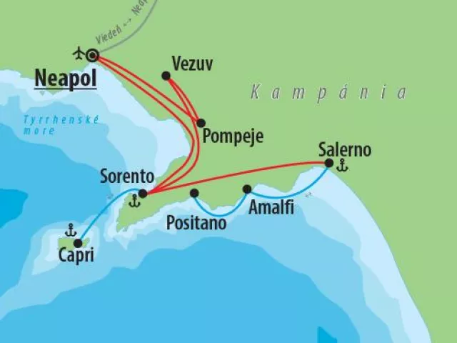 V rámci programu sa navštívia významné pamiatky ako Neapol, Capri, Positano, Amalfi, Vezuv a Pompeje, čím si účastníci zájazdu môžu vychutnať jedinečné kultúrne a historické bohatstvo regiónu.
