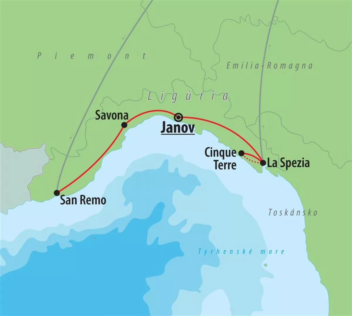 Počas šesťdňového poznávacieho zájazdu sa zúčastníte na prehliadkach malebných miest Ligúrie a ochutnáte atmosféru Talianska. V programe sú zahrnuté výlety do miest ako San Remo, Savona a Janov, a unikátne dedinky Cinque Terre.