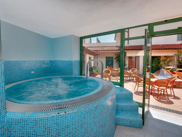 bazén 15 × 7 m s detskou časťou, ležadlami a slnečníkmi (obmedzený počet), biliard, stolný tenis, úschovňa bicyklov, malé wellness centrum: vírivka, tropická sprcha, posilňovňa