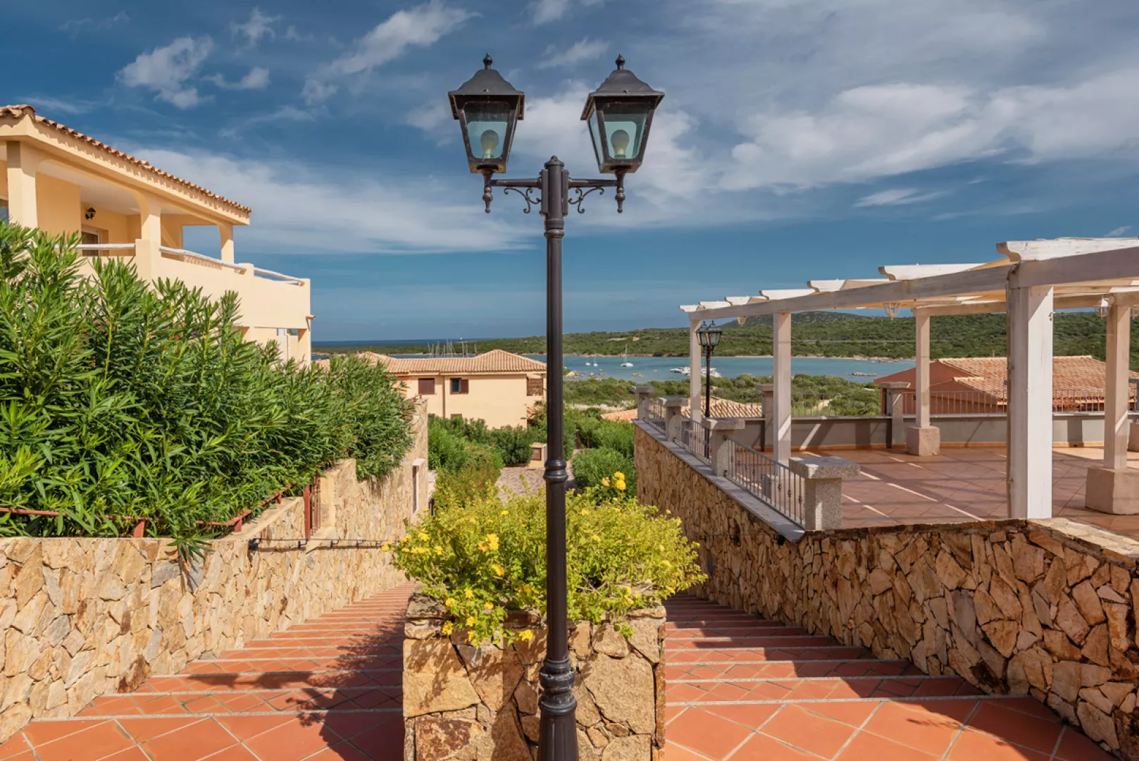 rozsiahly komplex dvojpodlažných radových víl v súkromnom vlastníctve v zálive Golfo di Marinella; apartmány na prízemí majú malú záhradku, apartmány na poschodí samostatný balkón alebo terasu spoločnú pre 2 či 3 apartmány; niektoré apartmány majú navyše bočný alebo priamy výhľad na more (označené ako VM)