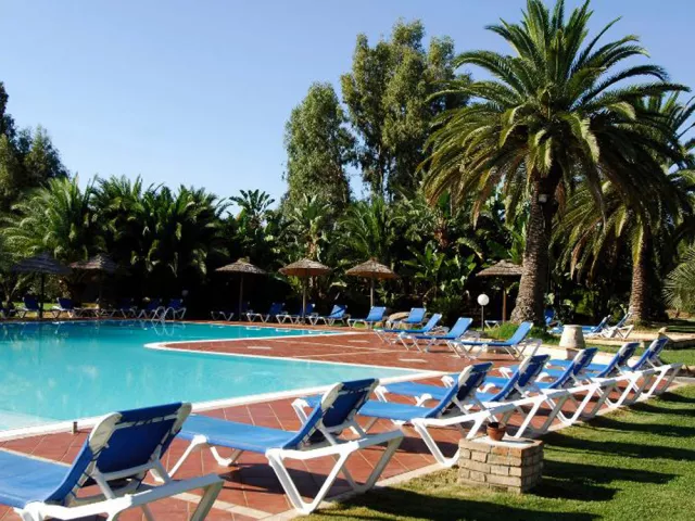 bazén s ležadlami a slnečníkmi s oddelenou časťou pre deti