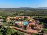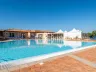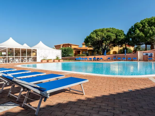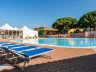 bazén so slnečníkmi a ležadlami, detské ihrisko