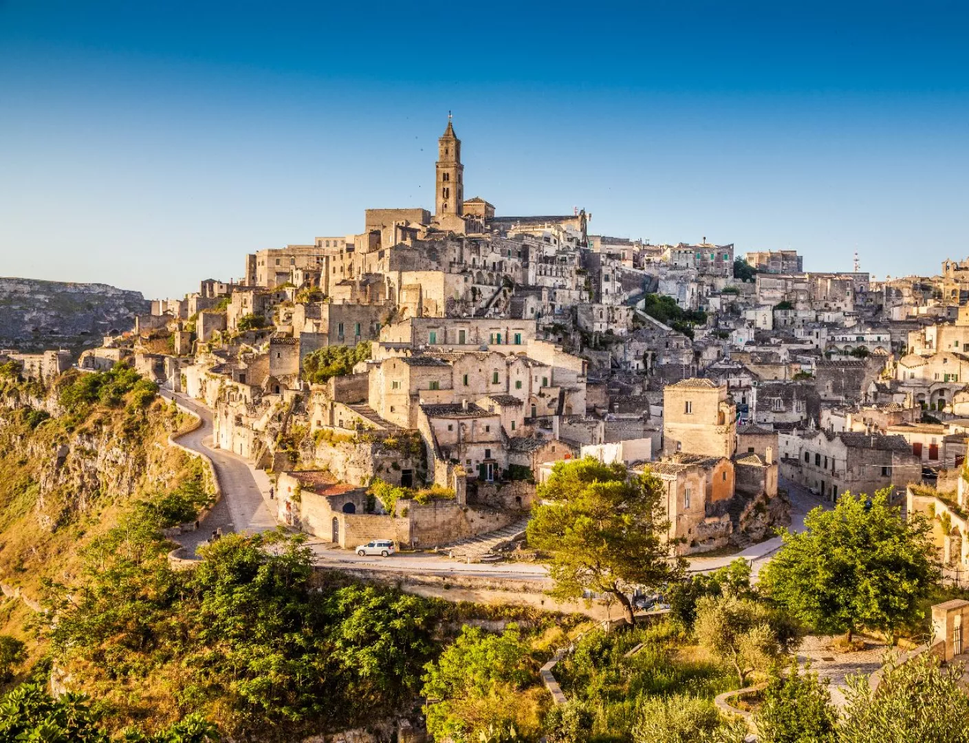 MATERA Vydáme sa cez krásne scenérie apúlskeho vidieka do jedinečnej Matery . Mesto na strmých skalnatých kopcoch, zapísané do svetového dedičstva UNESCO. Jej historické jadro, známe ako Sassi di Matera, tvorí fascinujúci labyrint kamenných obydlí vytesaných priamo do vápencových skál. Pri prechádzke úzkymi uličkami objavíme jaskynné domy, kostoly aj celé štvrte, ktoré vytvárajú jedinečnú scenériu pripomínajúcu biblické časy. Práve preto sa Matera stala kulisou pre mnohé historické filmy, vrátane snímok ako Umučenie Krista.