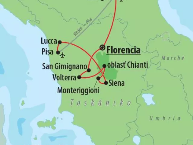 Navštívte významné miesta ako Pisa, Lucca, Siena, Monteriggioni, oblasť Chianti, Volterra, San Gimignano a Florenciu.