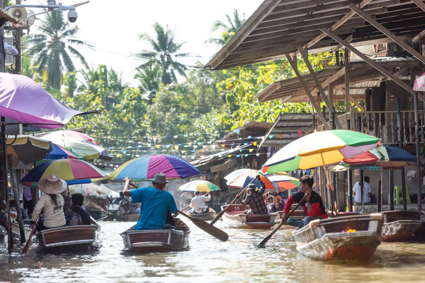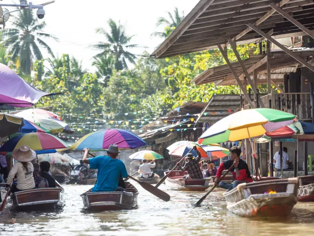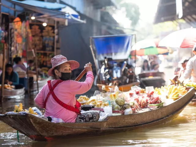 BANGKOK-PLÁVAJÚCE TRHY-NAKHOM PATHOM-BANGKOK Skoro ráno opúšťame centrum Bangkoku a vydávame sa do okolia hlavného mesta. Hneď ráno nás čaká Talad Rom Hub (Maeklong Market), kde sa pozrieme, ako dokáže zmiznúť trhovisko, aby urobilo priestor prechádzajúcemu vlaku. Pokračujeme na najznámejší plávajúci trh Damnoen Saduak , fotogenický vír farieb a chutí. Ochutnáte kokosové palacinky či čerstvý rambutan alebo longan? Čo to je? Vysvetlíme si. Po dobrom obede pokračujeme do mesta Nakhon Pathom, kde navštívime najväčšiu stupu v Thajsku, gigantickú Phra Pathommachedi a prenikneme do tajov budhizmu. Podvečer sa vraciame do hlavného mesta a okúsime nočný život Bangkoku.