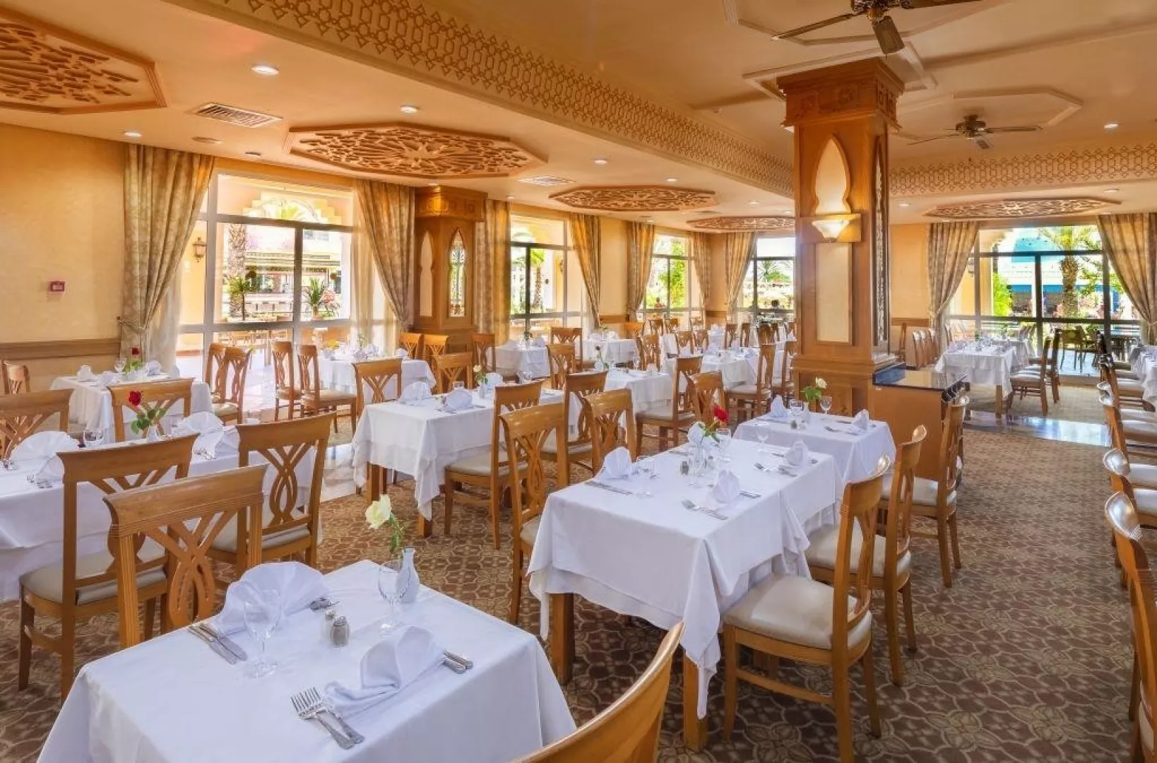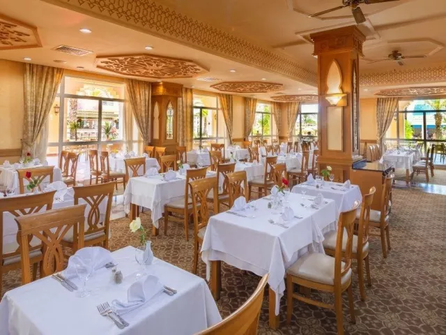 All Inclusive: Hlavná reštaurácia: 7.30–10.00 raňajky formou studeného aj teplého bufetu, obed 13.00–14.30 formou bohatého bufetu, večera 18.30–21.30 formou bohatého bufetu so širokým výberom čerstvých šalátov, hlavných jedál, ovocia a dezertov. Pri raňajkách káva, čaj, džús, voda, pri obede a večeri nealkoholické nápoje, pivo, víno, tvrdý alkohol (všetko miestnej výroby, rozlievané)Lobby bar: 10.00-24.00 nealkoholické nápoje, pivo, víno, tvrdý alkohol (všetko miestnej výroby, rozlievané), káva a čajBarbecue bar: 13.00-14.30 grilované špeciality, šaláty, ovocie, dezertySnack Bar: 15.00–17.00 káva a sladké pečivo, palacinkyTematické reštaurácie: 19.00–21.30, 2× aj miesta podávania sa môžu zmeniť