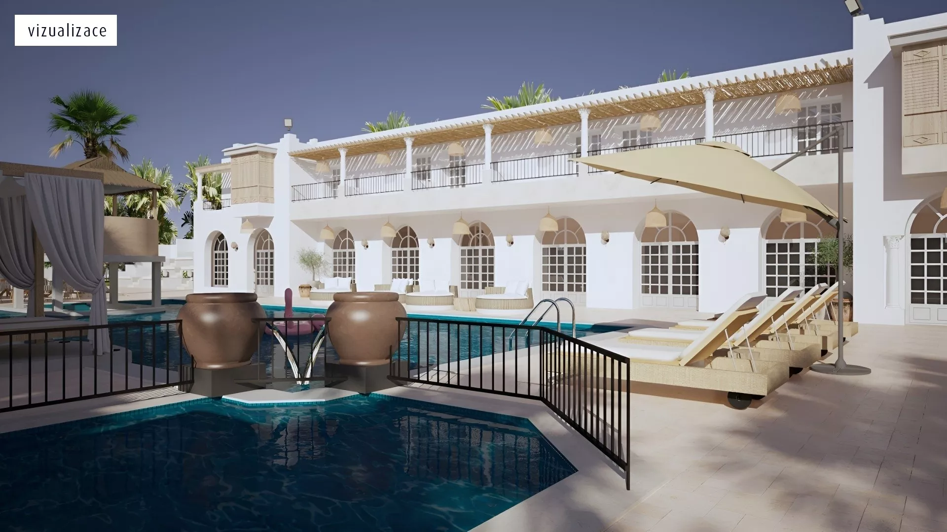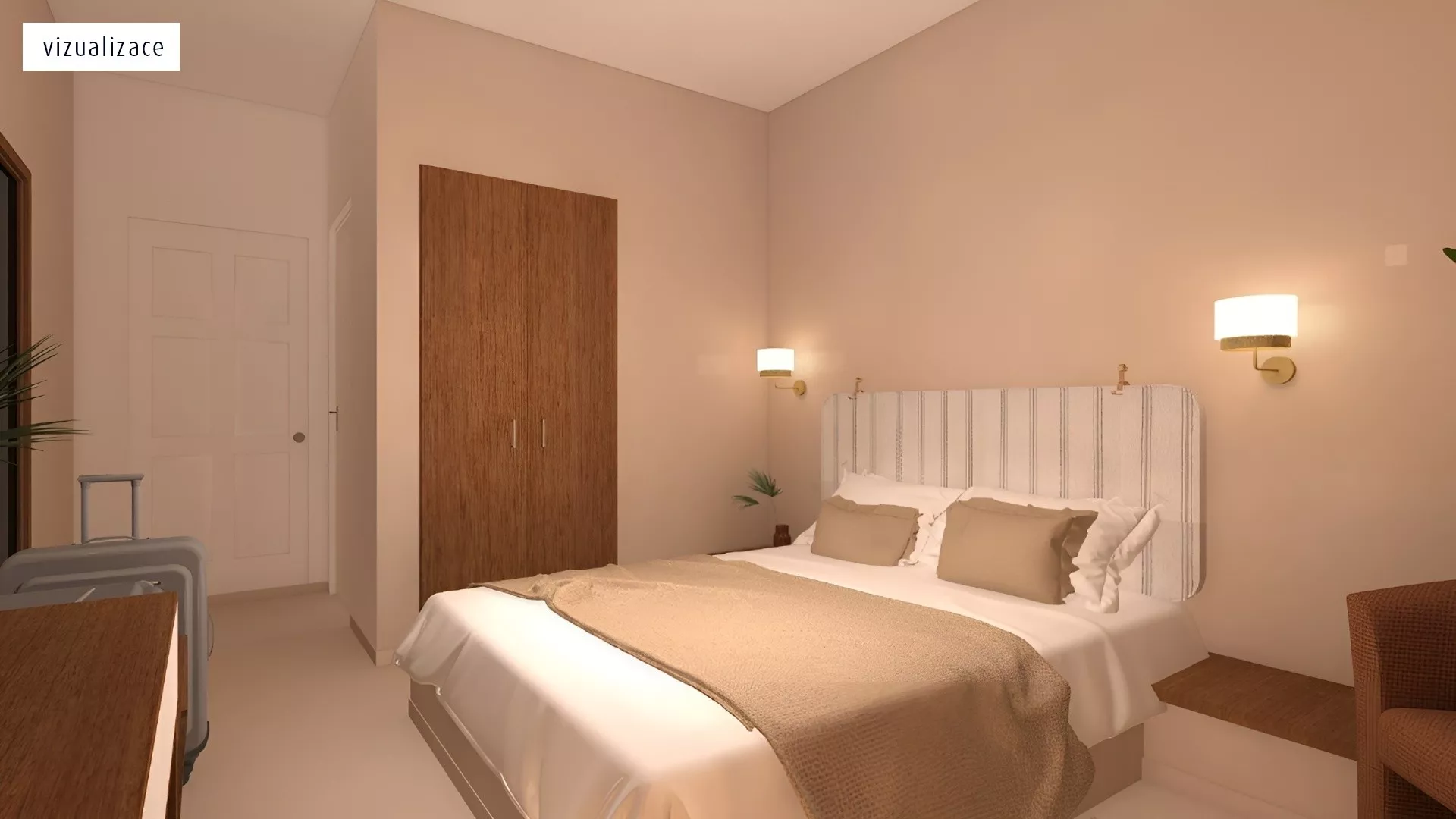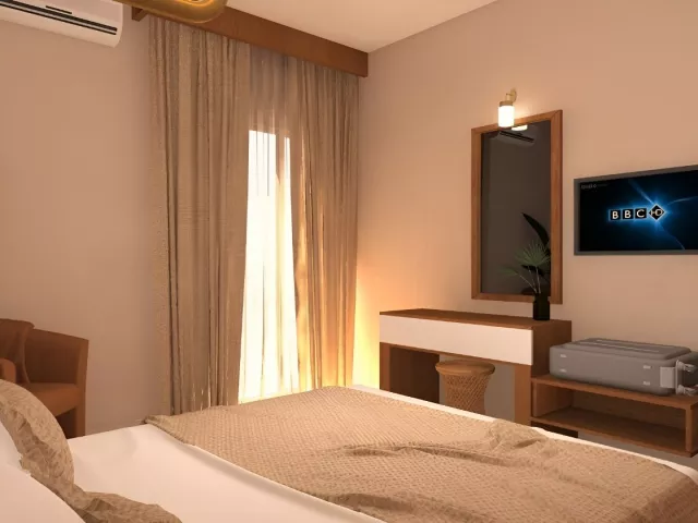 Dvojlôžková izba individuálne ovládaná klimatizácia (hlavná sezóna) telefón TV/sat. kúpeľňa/WC balkón alebo terasa iné typy izieb : suita - obývacia časť s prísteľkou, spálňa, rovnaké vybavenie ako dvojlôžková izba