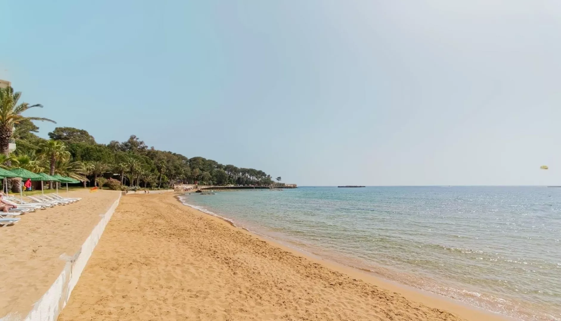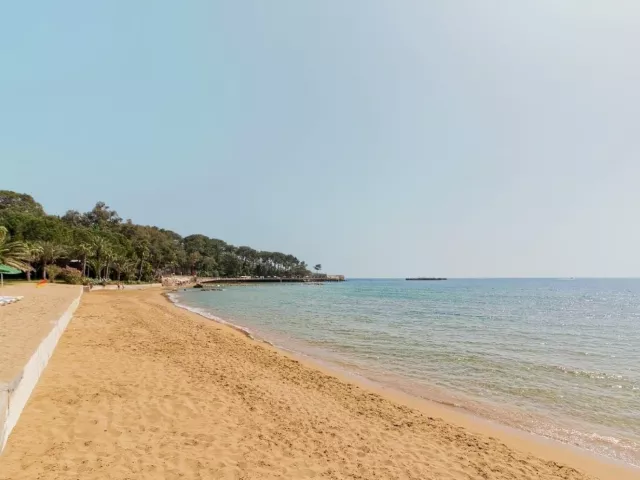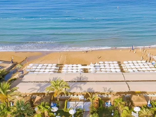 Pláž je piesočnatá a ponúka ležadlá, slnečníky a osušky zdarma.