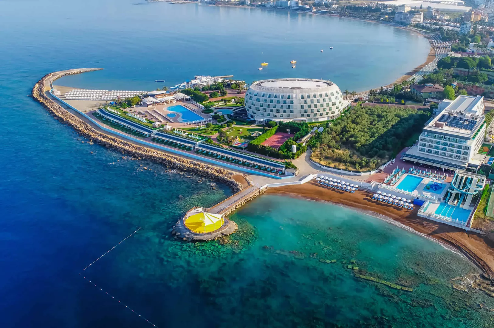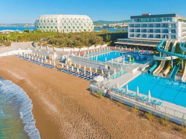 Moderný hotel Gold Island Family sa nachádza priamo pri súkromnej piesočnatej pláži v stredisku Avsallar na malebnom polostrove, ktorý ponúka nádherné výhľady na more. Hotel je ideálnou voľbou pre rodiny s deťmi, ktoré ocenia priestranné izby, bazény, aquapark a pestrý animačný program. Vzdialenosti: pláž 0 m, centrum (Avsallar) 500 m, nákupné možnosti 500 m, letisko 95 km.