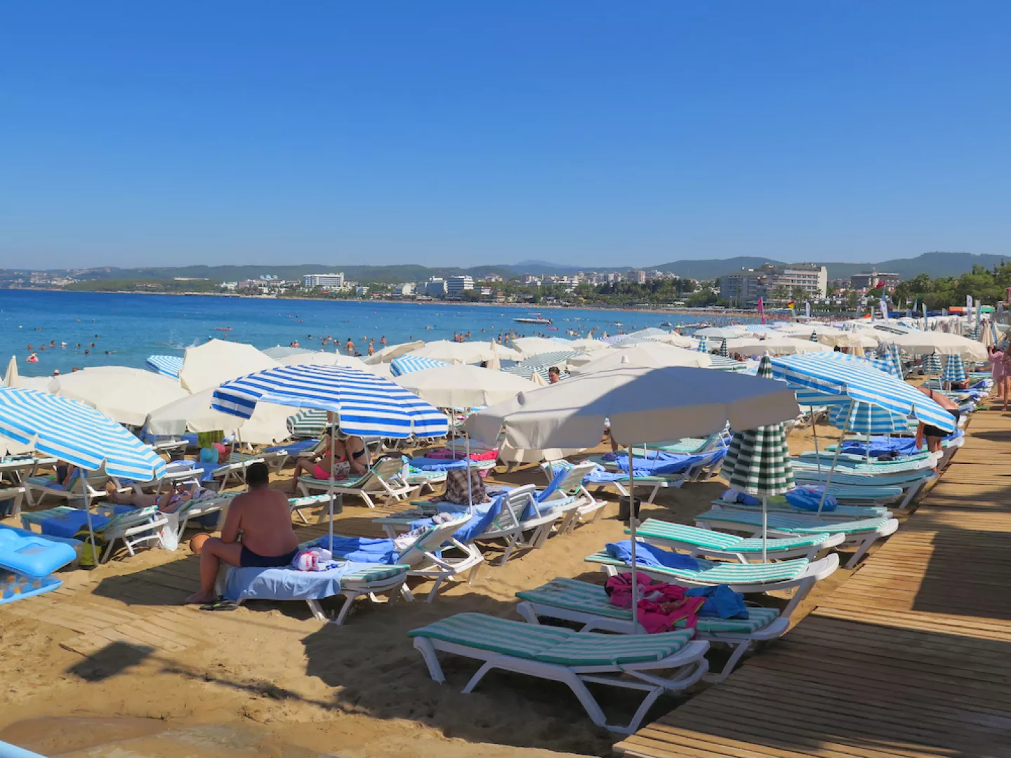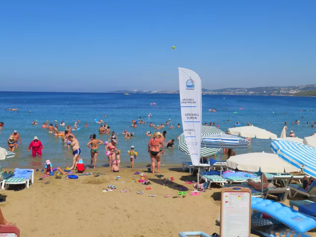 Hotelová pláž je piesočnatá a ocenená "Modrou vlajkou". Na pláži sú slnečníky, ležadlá, matrace a plážové osušky k dispozícii bez poplatku.