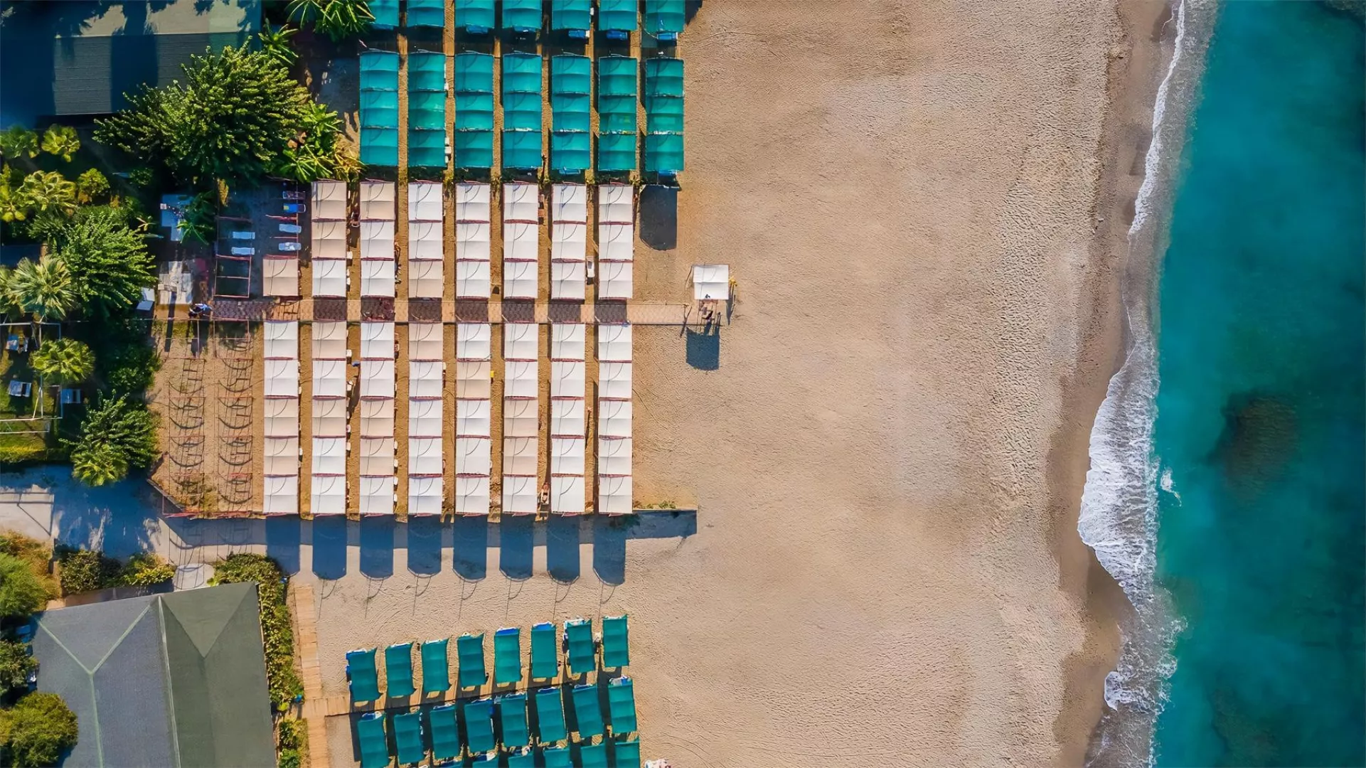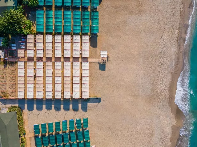 Pláž je piesočnatá s kamienkami, kde sú lehátka a slnečníky k dispozícii zdarma. Osušky sú za poplatok a na pláži sa nachádza aj bar.