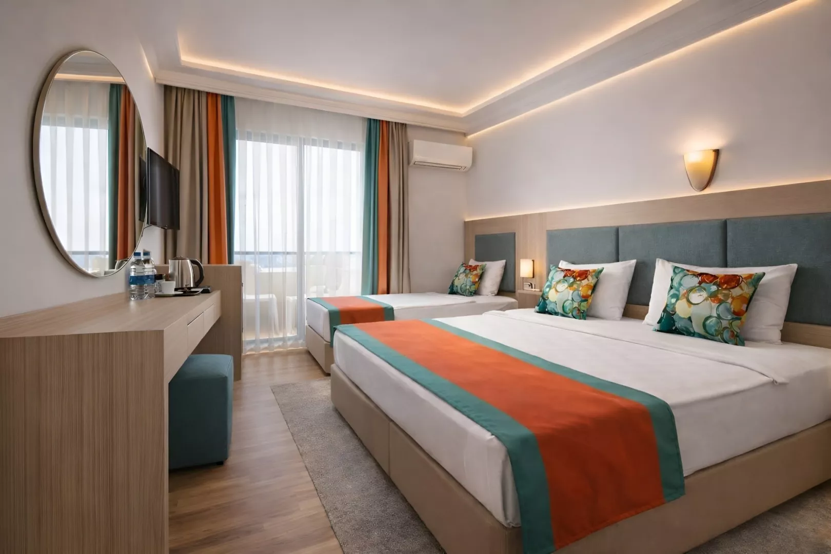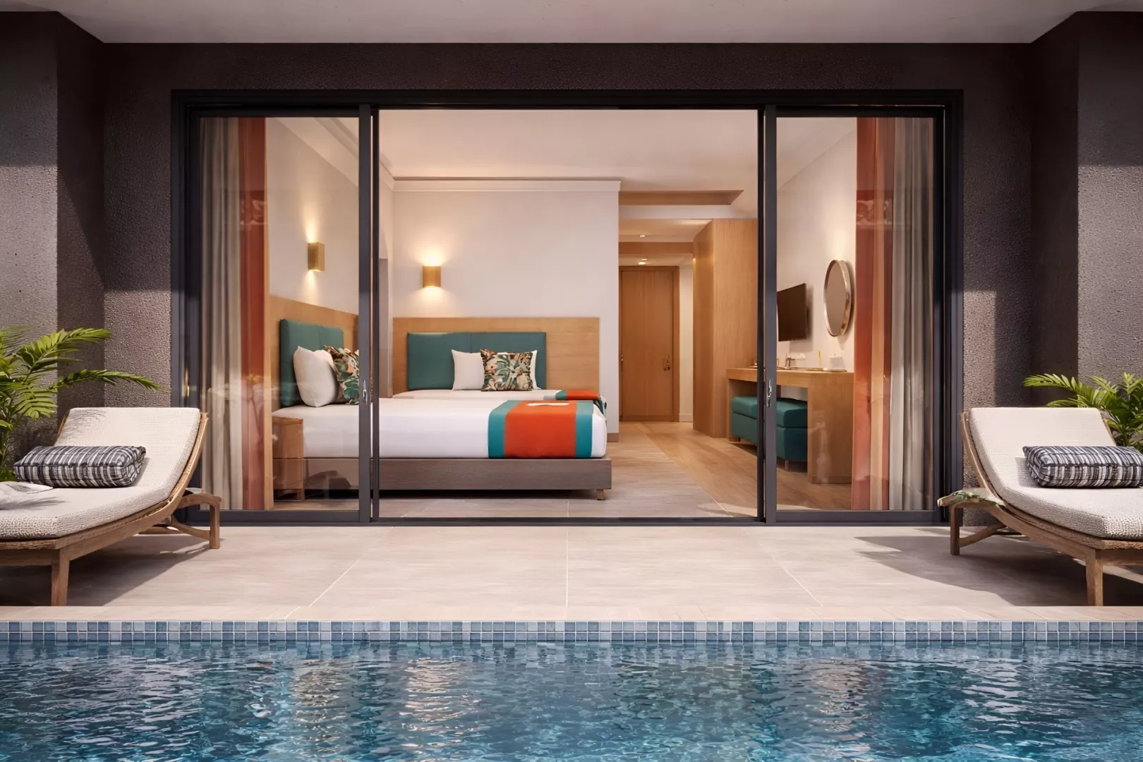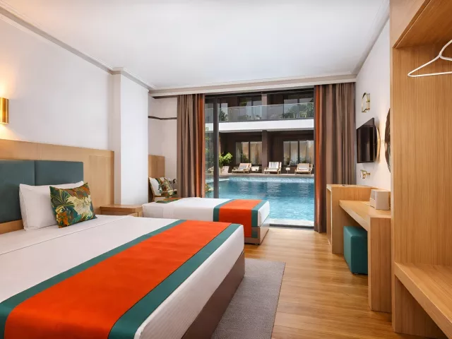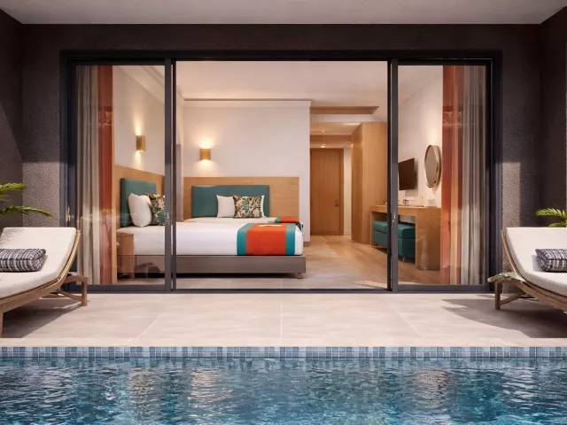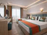 Dvojlôžková izba: kúpeľňa/WC (sušič vlasov), klimatizácia, telefón s priamym vytáčaním, Wi-Fi (zdarma), minibar (pri príchode naplnený vodou zdarma), trezor (zdarma), balkón alebo terasa, cca 18-22 m2. Ostatné typy izieb (pokiaľ nie je uvedené inak, majú izby vyššie uvedené vybavenie) Dvojlôžková izba, bočný výhľad na more Dvojlôžková izba, výhľad na more Dvojposteľová izba, Jacuzzi: k dospozícii vírivka. Dvojlôžková izba, Swim Up: prístup do zdieľaného bazéna priamo z terasy. Rodinná izba: 2 oddelené spálne Rodinná izba, výhľad na more: 2 oddelené spálne s výhľadom na more