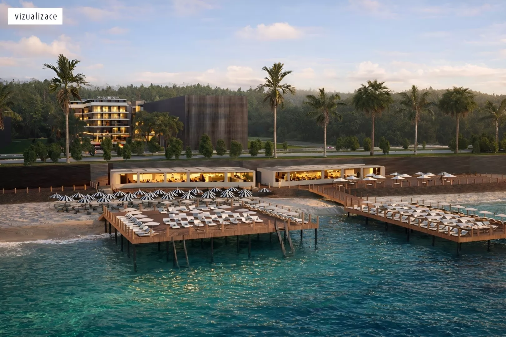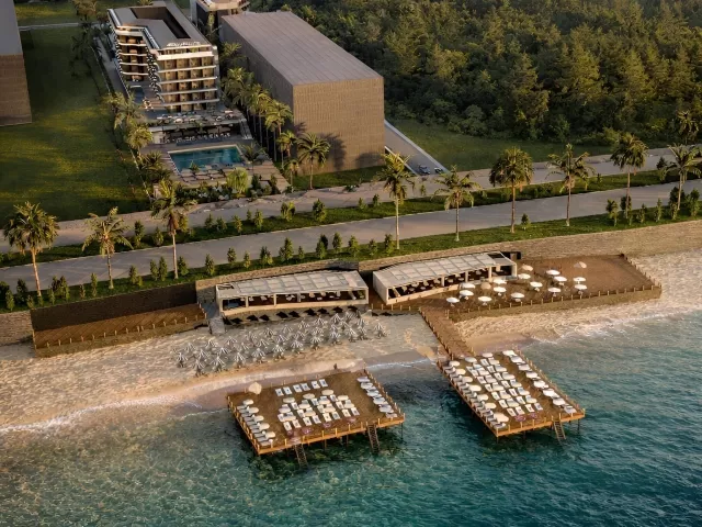 Piesočnato-kamienková pláž cca 40 m od hotela oddelená miestnou komunikáciou prístupná podchodom, pláž s kamenným vstupom do mora, pláž značne rozšírená o mólo, bar na pláži v rámci Ultra All Inclusive, ležadlá, slnečníky a osušky na pláži zadarmo.