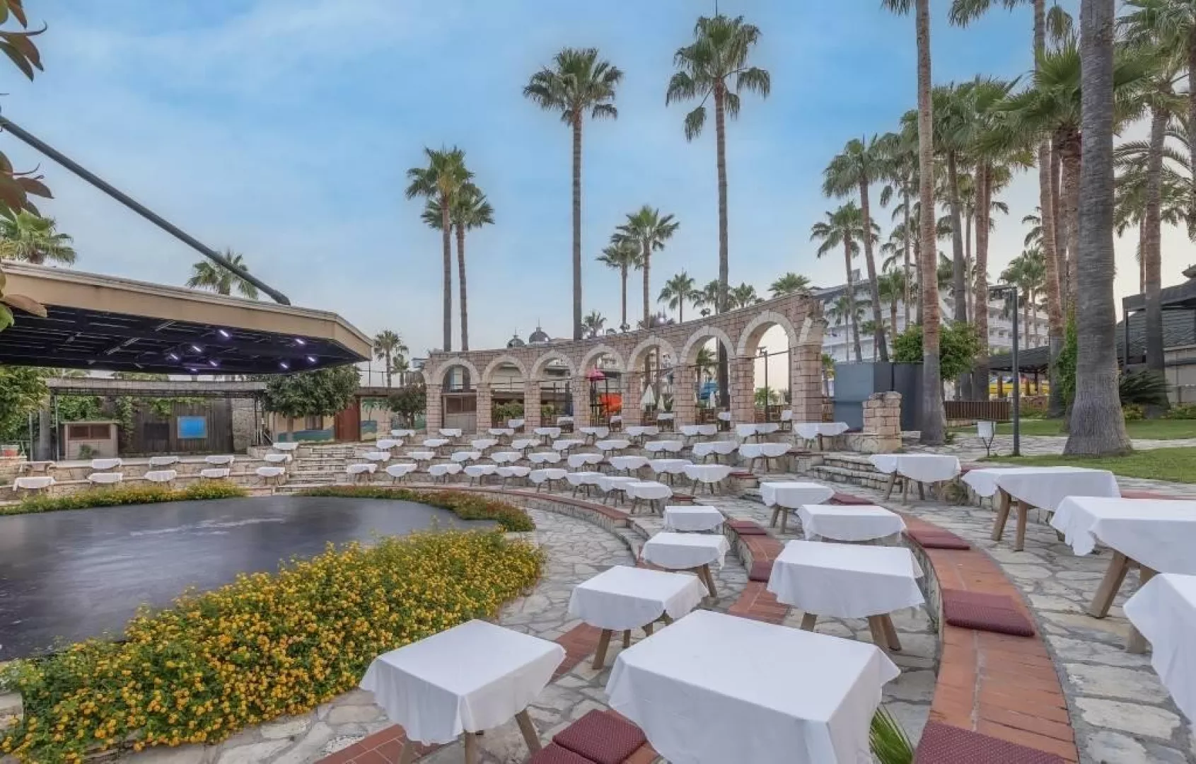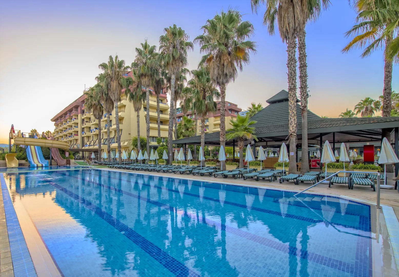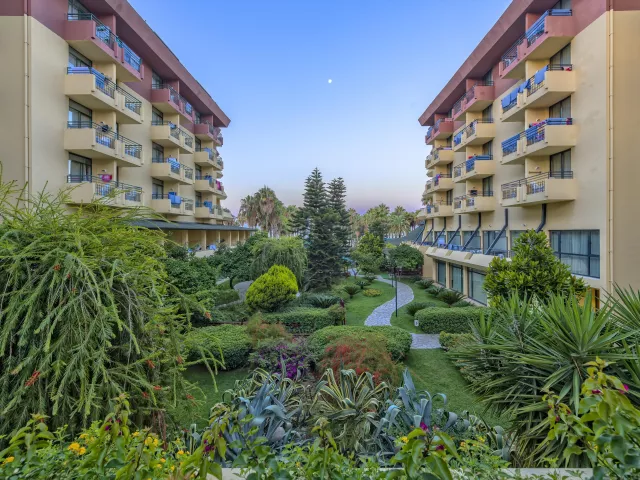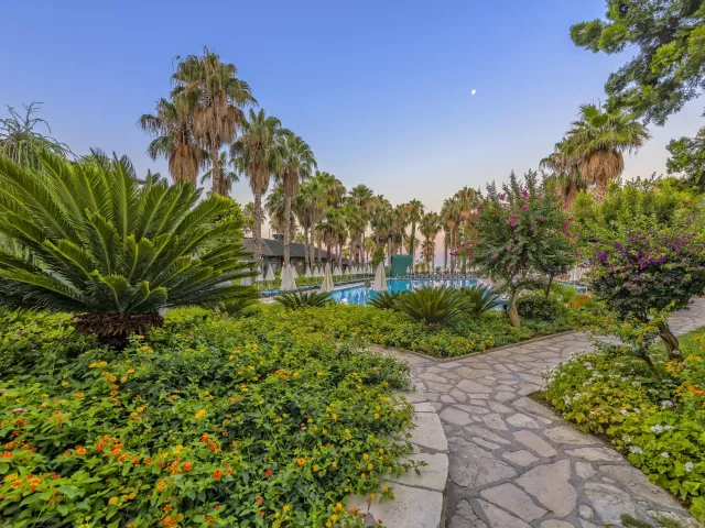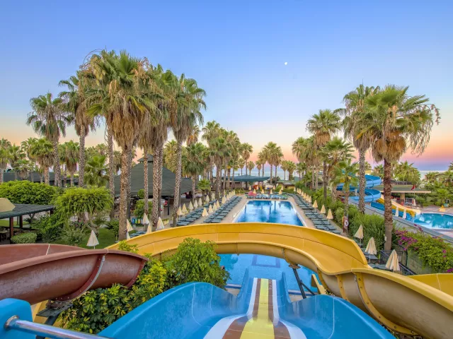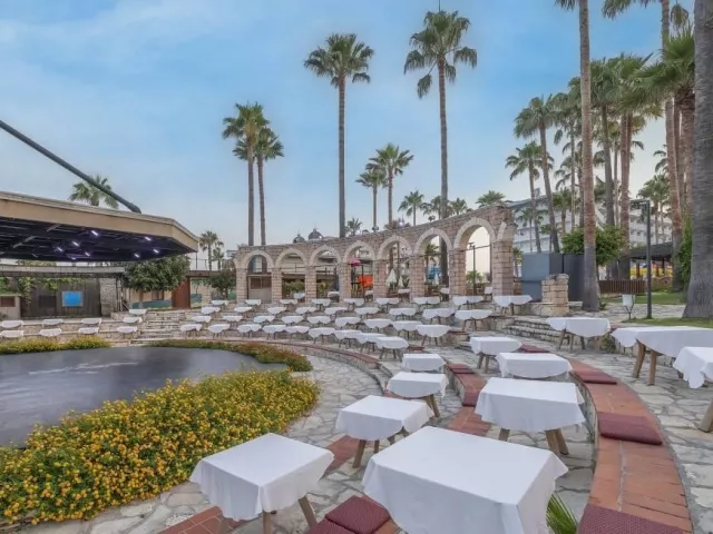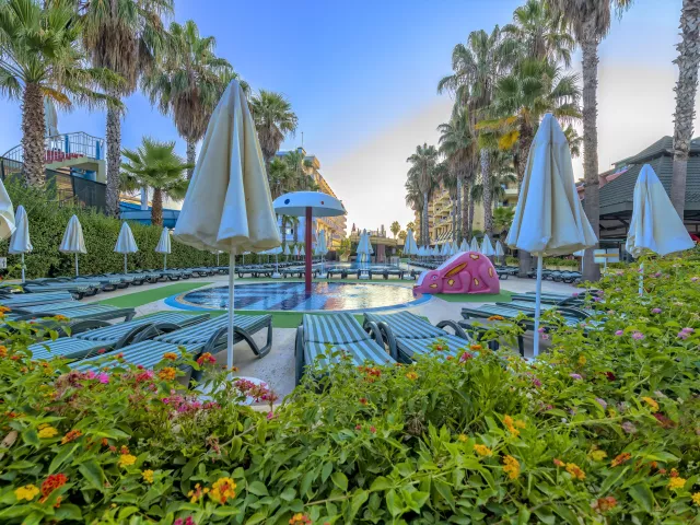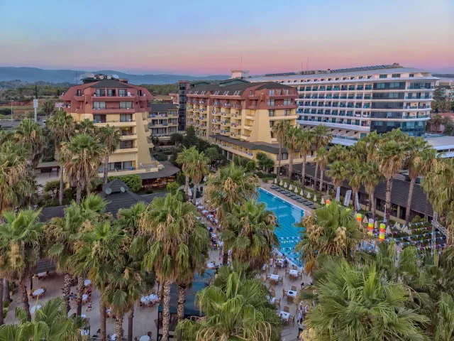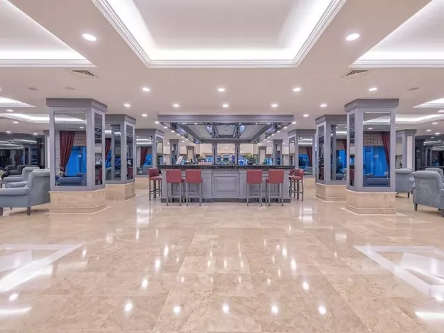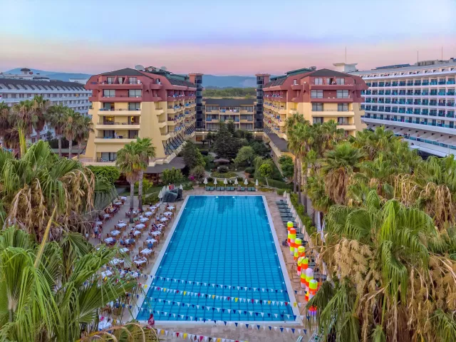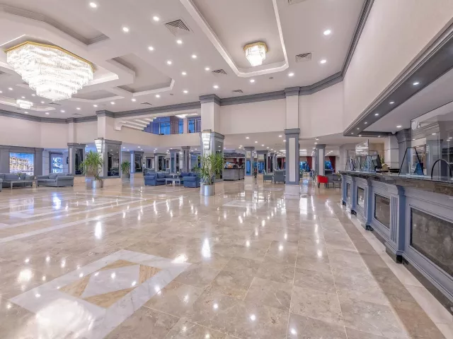 Hotel disponuje vstupnou halou s recepciou, reštauráciou, niekoľkými barmi, kaviarňou, kaderníctvom a malou obchodnou arkádou. V rámci areálu sa nachádzajú dva vonkajšie bazény, detský bazén a bazén so šmykľavkami (otvorené od 10:00 do 12:00 a od 15:00 do 17:00). Ležadlá, slnečníky a osušky sú k dispozícii zdarma, pričom výmena osušiek je za príplatok. V hoteli prebiehajú denné a večerné animačné programy.