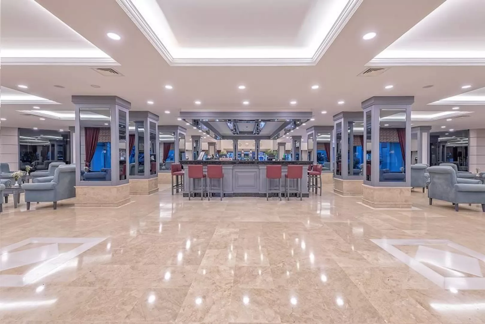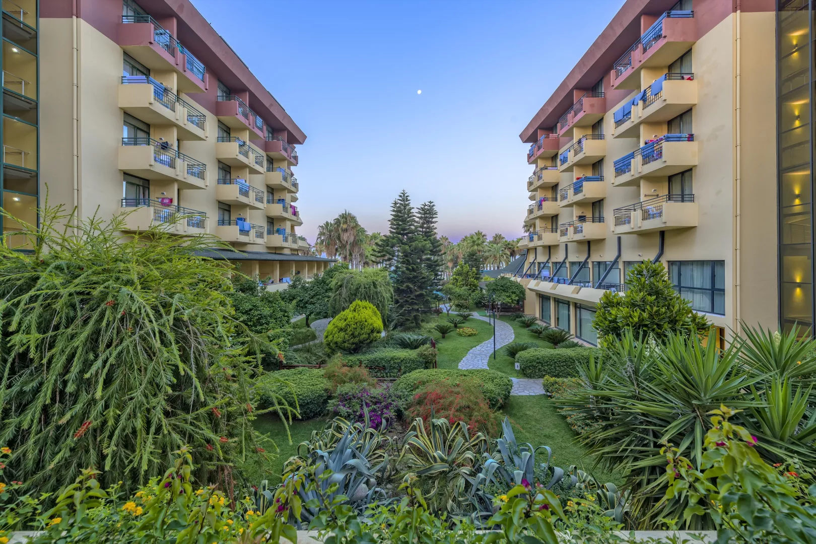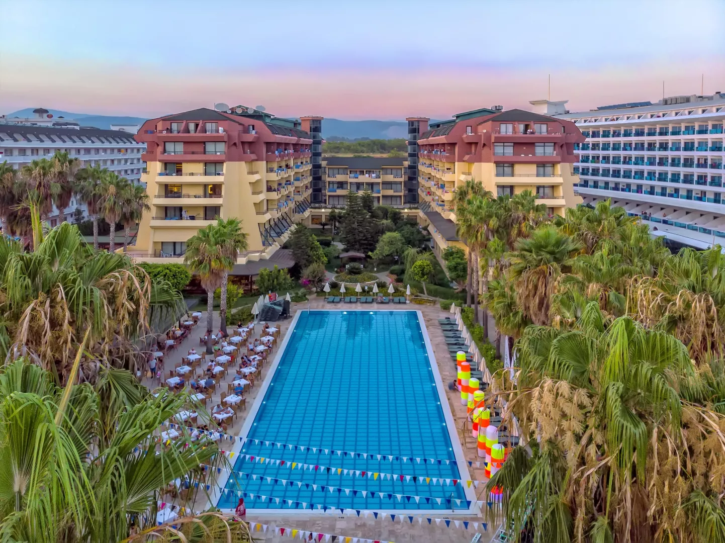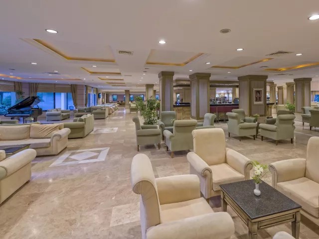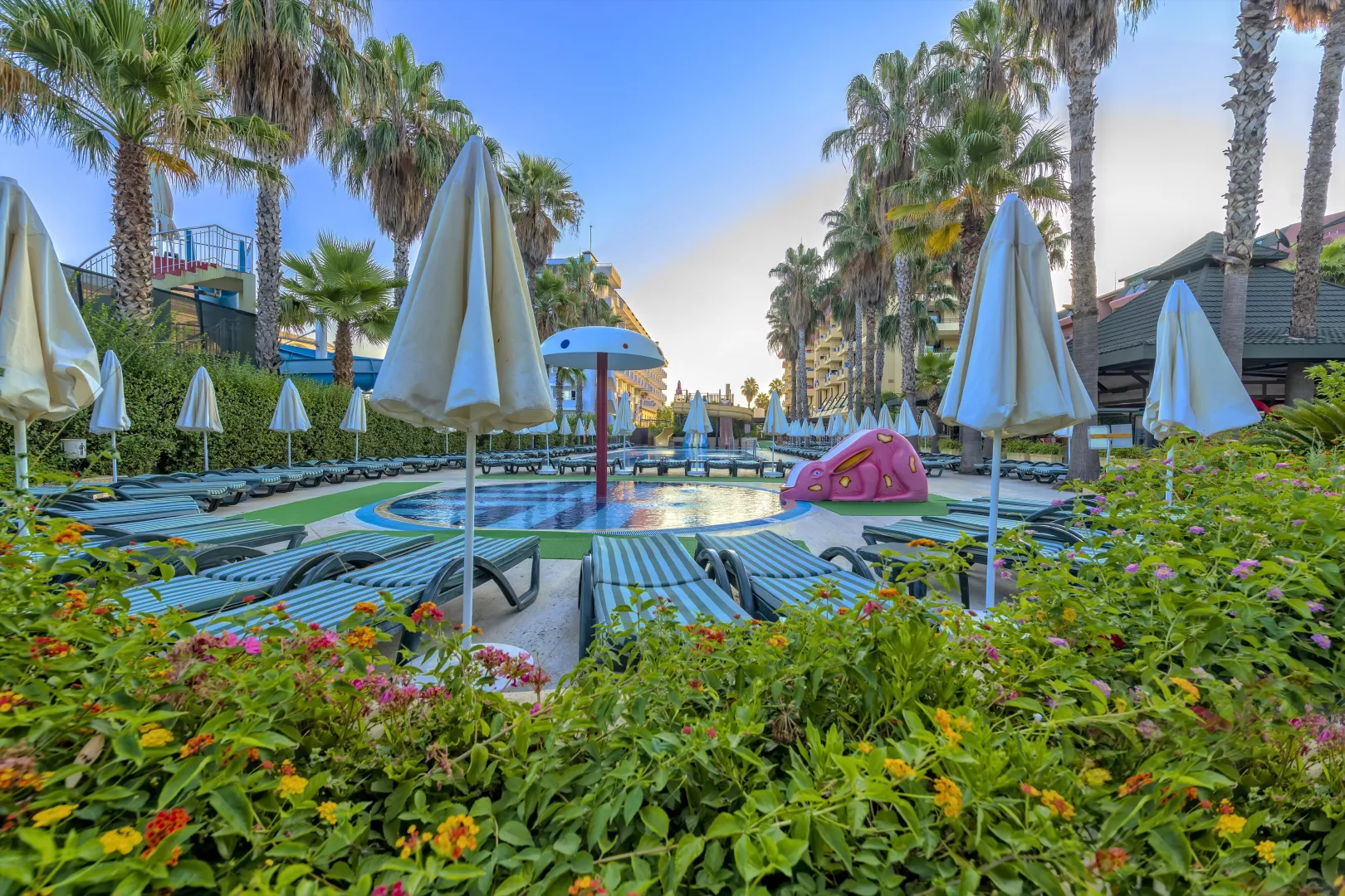 Hotel disponuje vstupnou halou s recepciou, reštauráciou, niekoľkými barmi, kaviarňou, kaderníctvom a malou obchodnou arkádou. V rámci areálu sa nachádzajú dva vonkajšie bazény, detský bazén a bazén so šmykľavkami (otvorené od 10:00 do 12:00 a od 15:00 do 17:00). Ležadlá, slnečníky a osušky sú k dispozícii zdarma, pričom výmena osušiek je za príplatok. V hoteli prebiehajú denné a večerné animačné programy.