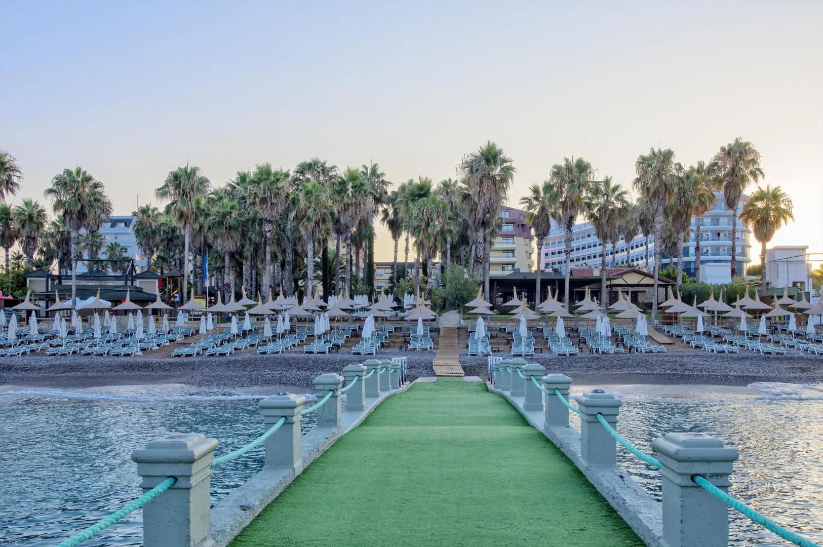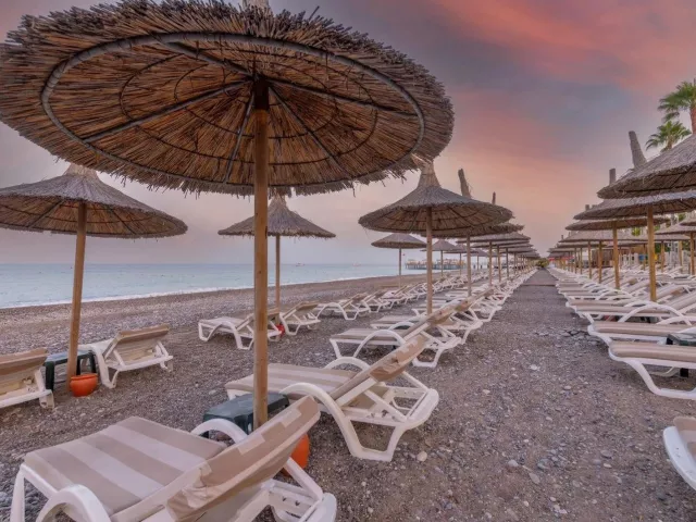 Hotel sa pýši súkromnou piesočnatou plážou s kamenistým vstupom do mora. Ležadlá a slnečníky sú na pláži k dispozícii zdarma, pričom bar na pláži je otvorený od 10:00 do 18:00. Odporúča sa nosiť topánky do vody pri vstupe do mora.