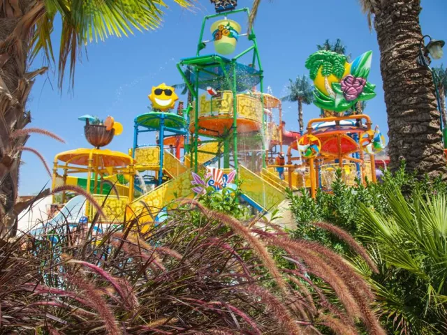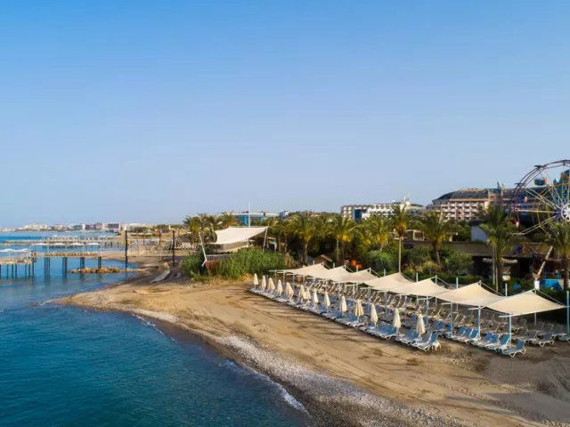 Piesočnatá pláž, dlhá 600 m, je prístupná cez podchod. K dispozícii sú ležadlá, slnečníky a matrace, ako aj plážový bar. Na pláži sa nachádza aj aquapark a lunapark zadarmo. Vodné športy a potápačské školy sú k dispozícii za poplatok.