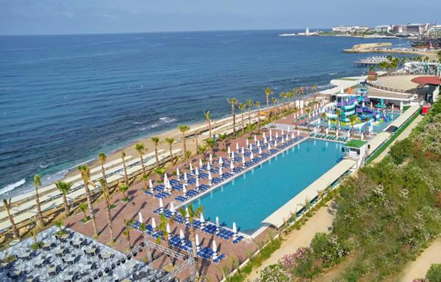 Hotel sa nachádza priamo pri súkromnej piesočnato-kamienkovej pláži, ktorú oddeľuje cesta a je prístupná cez most. Hostia si môžu užívať plážové ležadlá, slnečníky a osušky zdarma.
