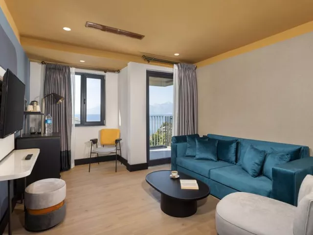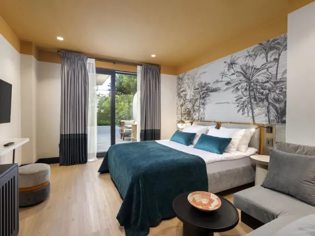IZBY: 28 izieb • balkón • centrálna klimatizácia • sušič na vlasy • TV • telefón • trezor • minibar za poplatok • set na prípravu čaju a kávy • župan a papuče • wifi • štandardné izby: 20 m², max. pre 3 osoby • garden suity: 35 m², max. pre 2+1 osoby • suity s výhľadom na more: 40 m², max. pre 3 osoby, 1 spálňa a 1 obývacia izba, izby oddelené dverami, 2 kúpeľne