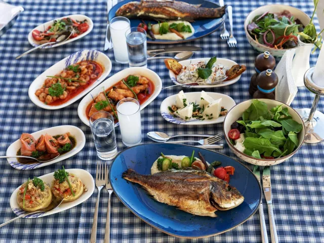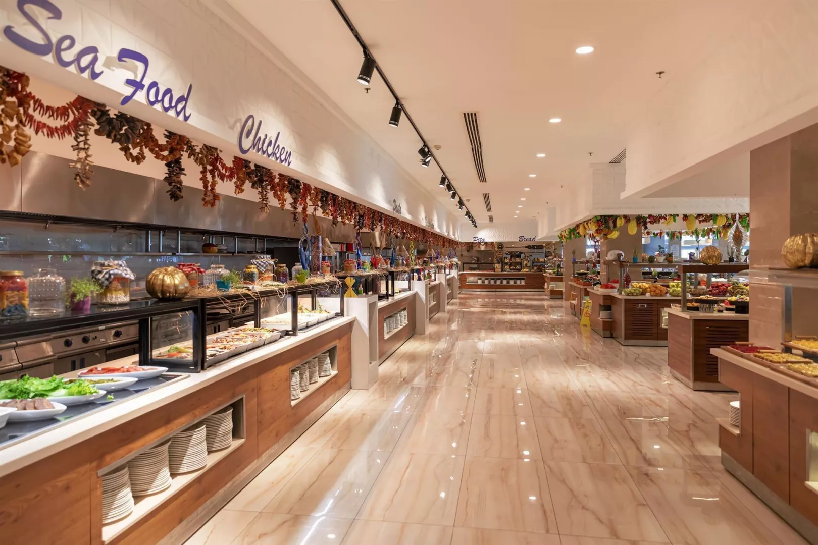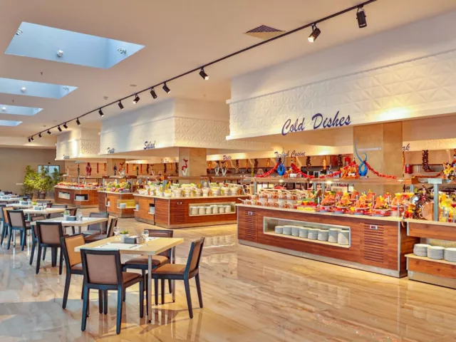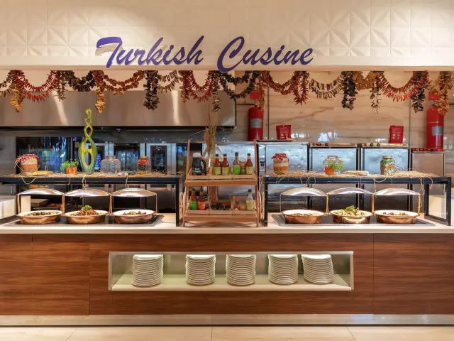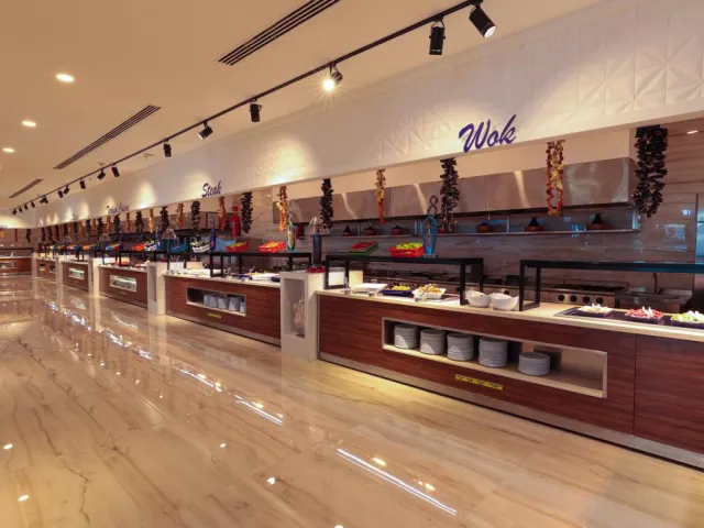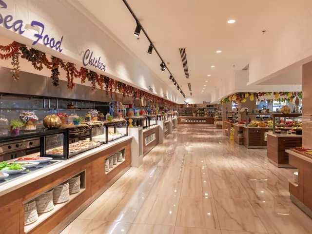 Hotel ponúka ultra all inclusive služby s raňajkami, obedmi a večerami formou bufetu. K dispozícii sú aj snacky, očarujúce turecké palacinky (gözleme), a zmrzlina. Zahrnuté sú miestne a niektoré importované alkoholické a nealkoholické nápoje 24 hodín denne.