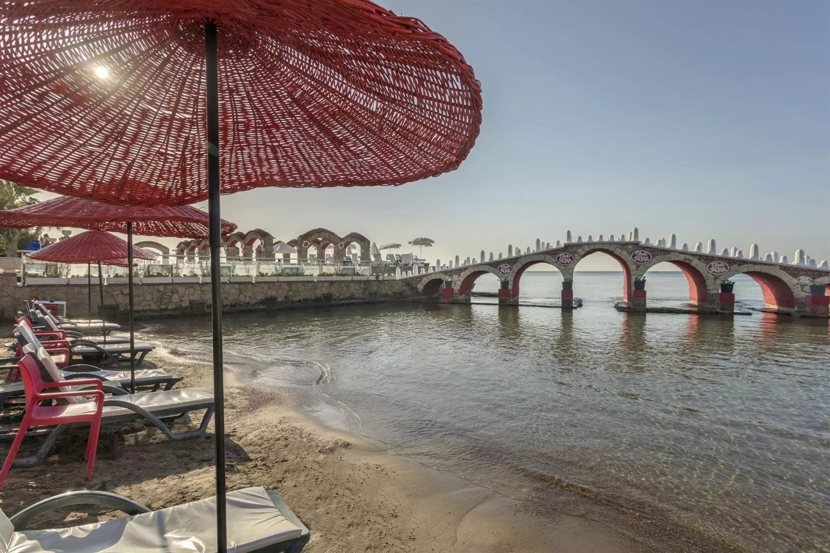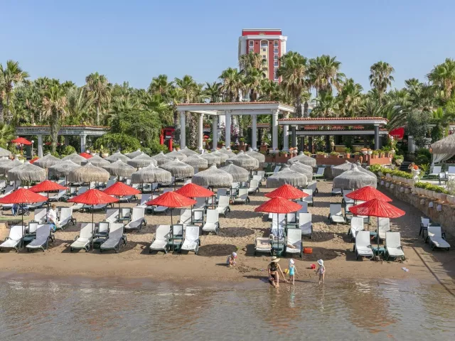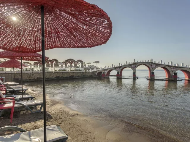 Hotel má prístup na súkromnú piesočnatú pláž s kamienkami, ktorá je vzdialená 200 m od hlavnej budovy. Pláž je vybavená ležadlami, slnečníkmi a plážovými osuškami. Okrem toho je k dispozícii aj mólo pre lepší prístup k moru.