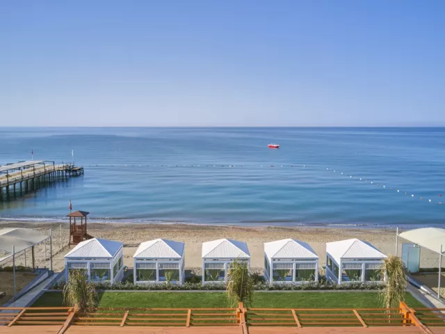 pláž ocenená Modrou vlajkou • hotelová široká pláž s jemným pieskom aj v mori • pozvoľný vstup do mora • slnečníky a ležadlá (zdarma) • plážové osušky (zdarma) • vodné športy (za poplatok)