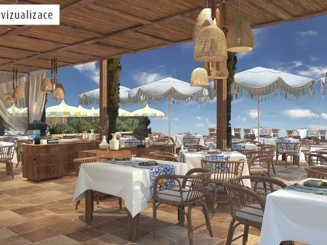 vstupná hala s recepciou hlavná budova niekoľko 1-2 poschodových budov v terasovite záhrade. 6 a la carte reštaurácií s obsluhou (nutná rezervácia, niektoré za poplatok) snack bary bary food trucky kaviarne patisérie zmrzlina vonkajší bazén mini klub spa obchody práčovňa diskoteka wifi (zadarmo v celom areale hotela) Rybie a la carte (nutná rezervácia poplatok 50 Euro osoba) Tematicka a la carte (nutná rezerácia, za poplatok výber z menu) Sushi a la carte reštaurácia ( nutná rezervácia poplatok 50 Euro osoba) Talianska a la carte reštaurácia (nutná rezervácia poplátok 30 Euro osoba) Stredomorská a la carte reštaurácia ( nutná rezervácia poplátok 30 euro osoba)