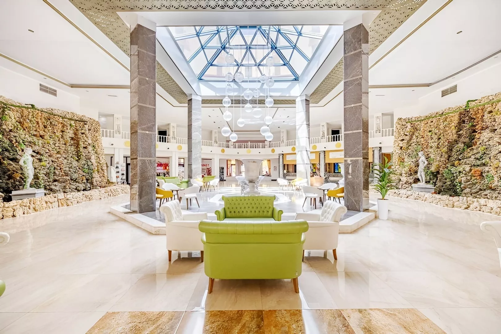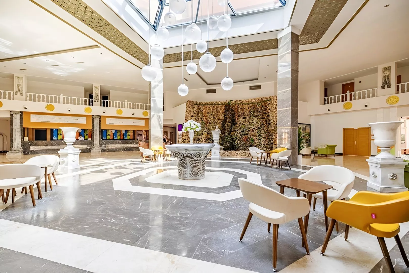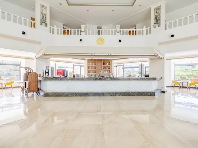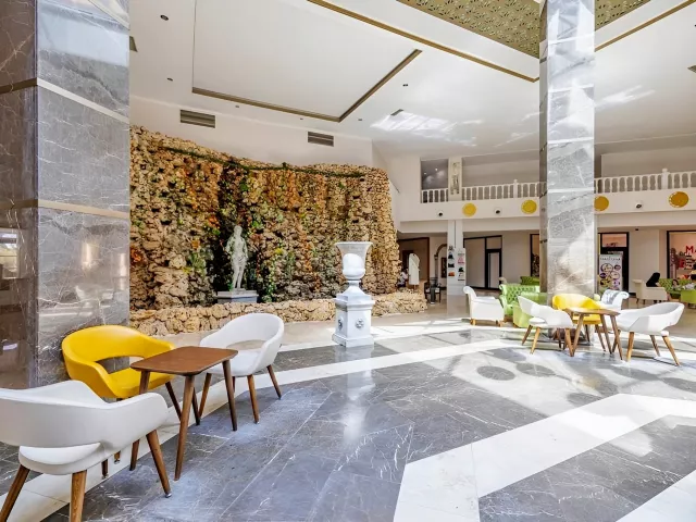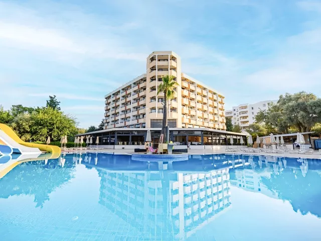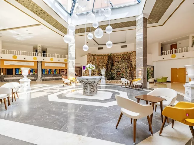 vstupná hala s recepciou hlavná päť podlažná budova so štyrmi výťahmi snack bar bary wifi (zadarmo v celom areale hotela) komferenčná miestnosť SPA obchody práčovňa kaderník 2 bazény (lehátka, slnečníky a osušky zdarma) detský bazén 3 šmykľavky terasa na slnenie mini klub