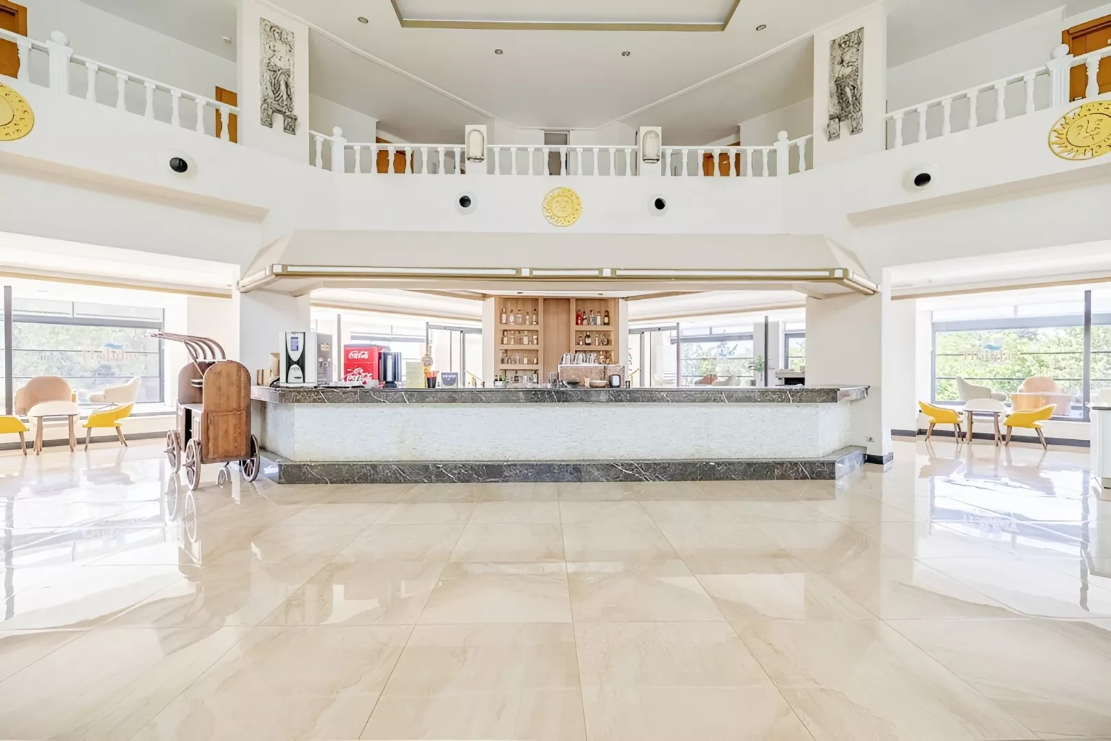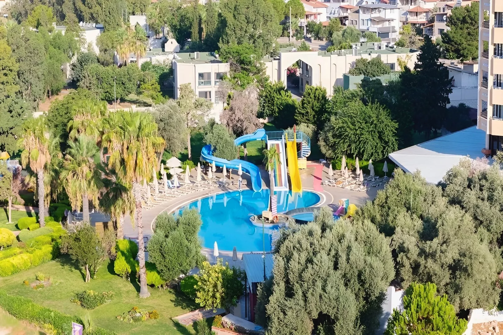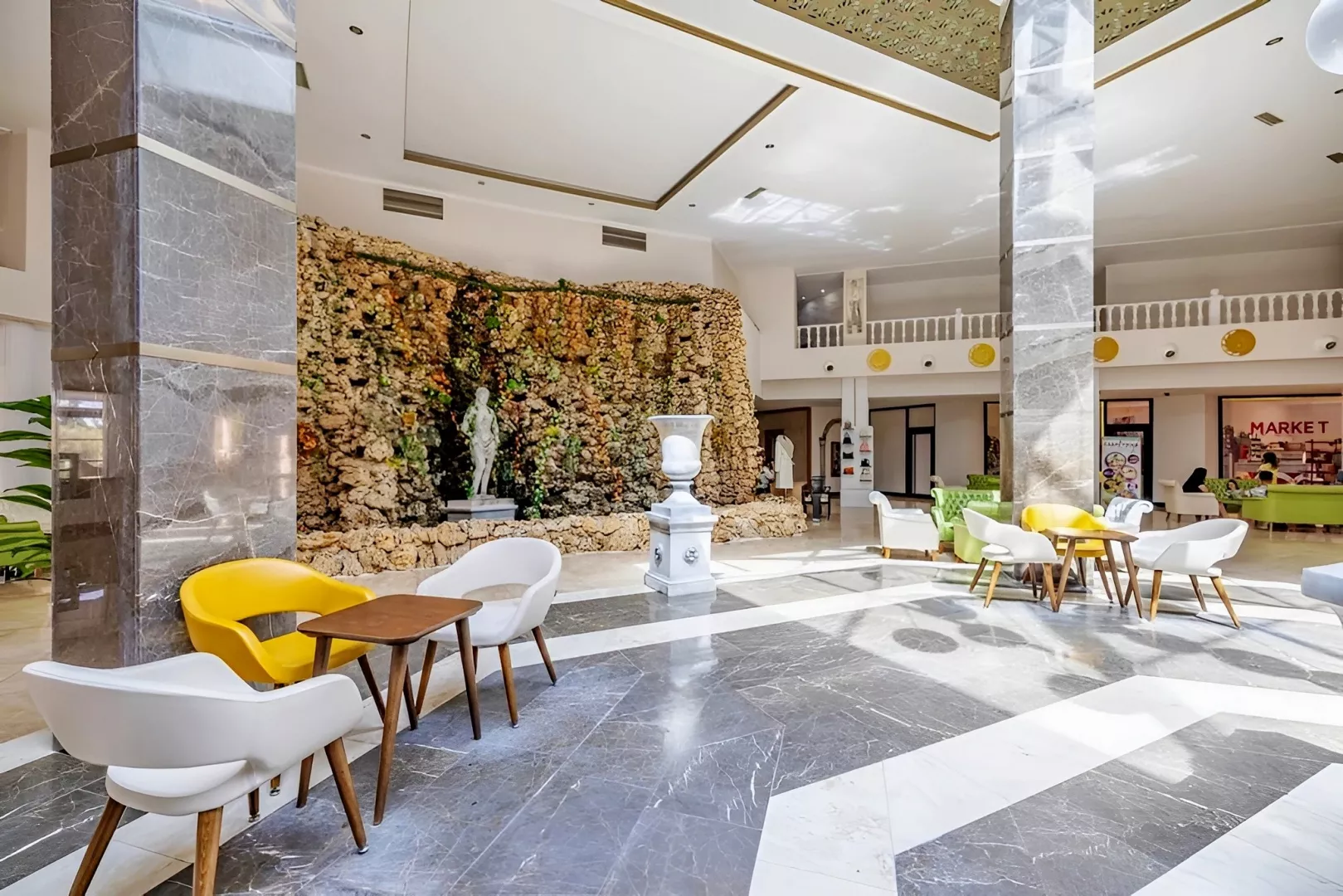 vstupná hala s recepciou hlavná päť podlažná budova so štyrmi výťahmi snack bar bary wifi (zadarmo v celom areale hotela) komferenčná miestnosť SPA obchody práčovňa kaderník 2 bazény (lehátka, slnečníky a osušky zdarma) detský bazén 3 šmykľavky terasa na slnenie mini klub