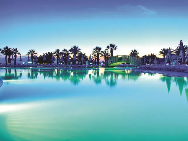 Vstupná hala s recepciou výťah 2 reštaurácie s obsluhou (nutná rezervácia, talianska a morské plody raz za pobyt zadarmo) Hlavná reštaurácia Snack bar Patisserie Loby bar Bar pri bazéne Diskotéka 2 tenisové kurty Mini Golf Stolný tenis Plocha na cvičenie v záhrade Mólo 2 bazény pre dospelých 2 detský bazény Bazén so šmykľavkami Spa 3 šmykľavky