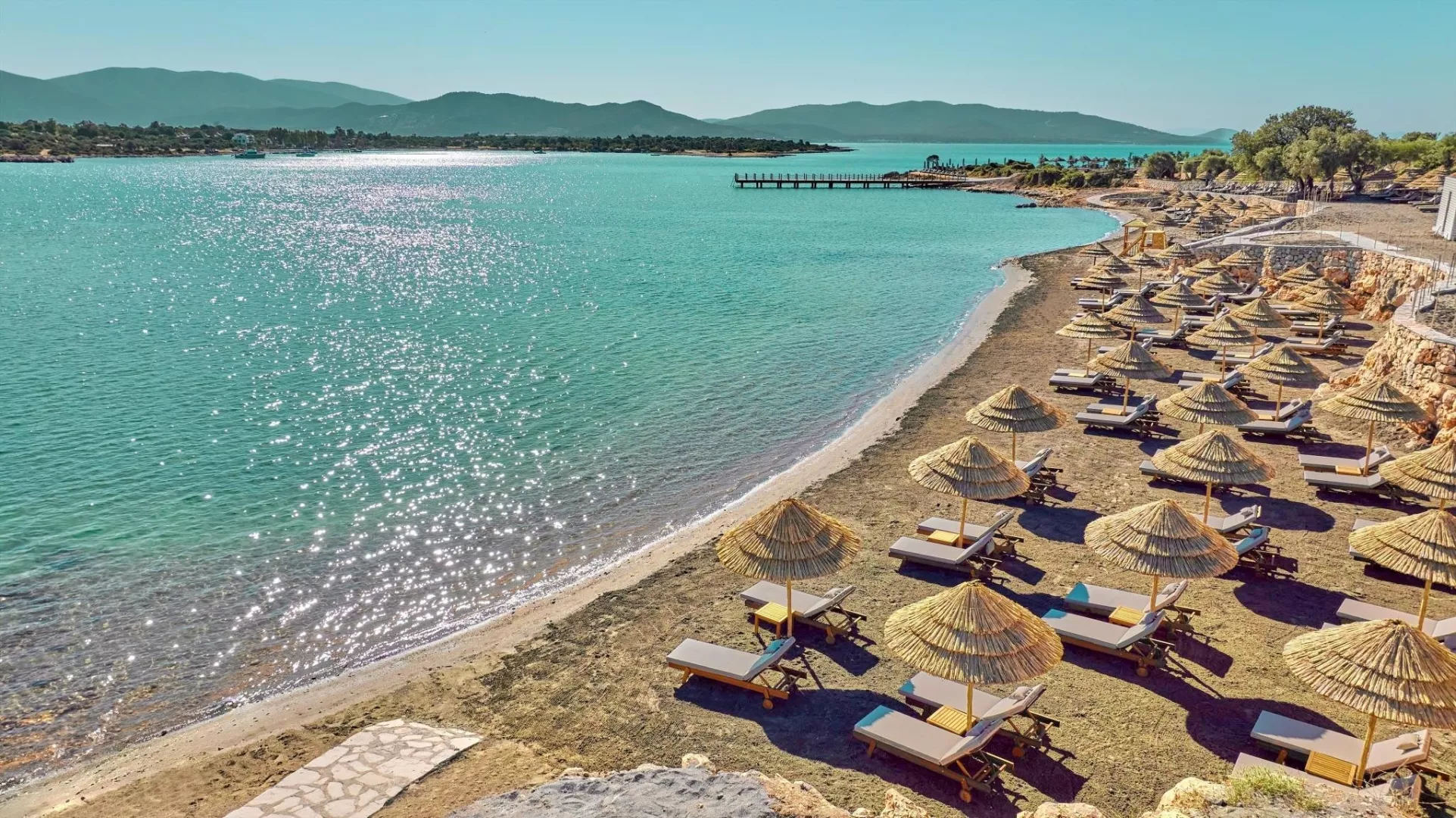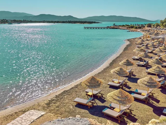 Na pláži, ktorá sa nachádza priamo pri hoteli, sú k dispozícii lehátka, matrace a slnečníky zdarma. Pavilóny sú k dispozícii za poplatok. Piesočnatá pláž s pozvoľným vstupom do mora ponúka ideálne podmienky na relaxáciu a vodné športy.