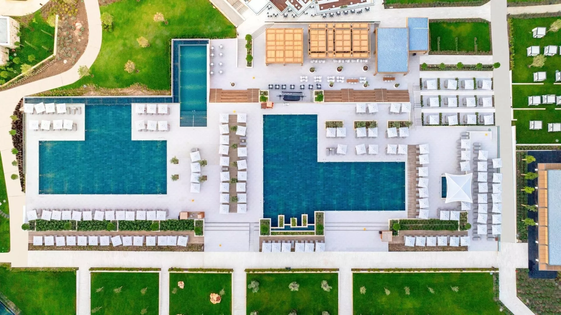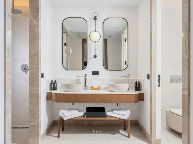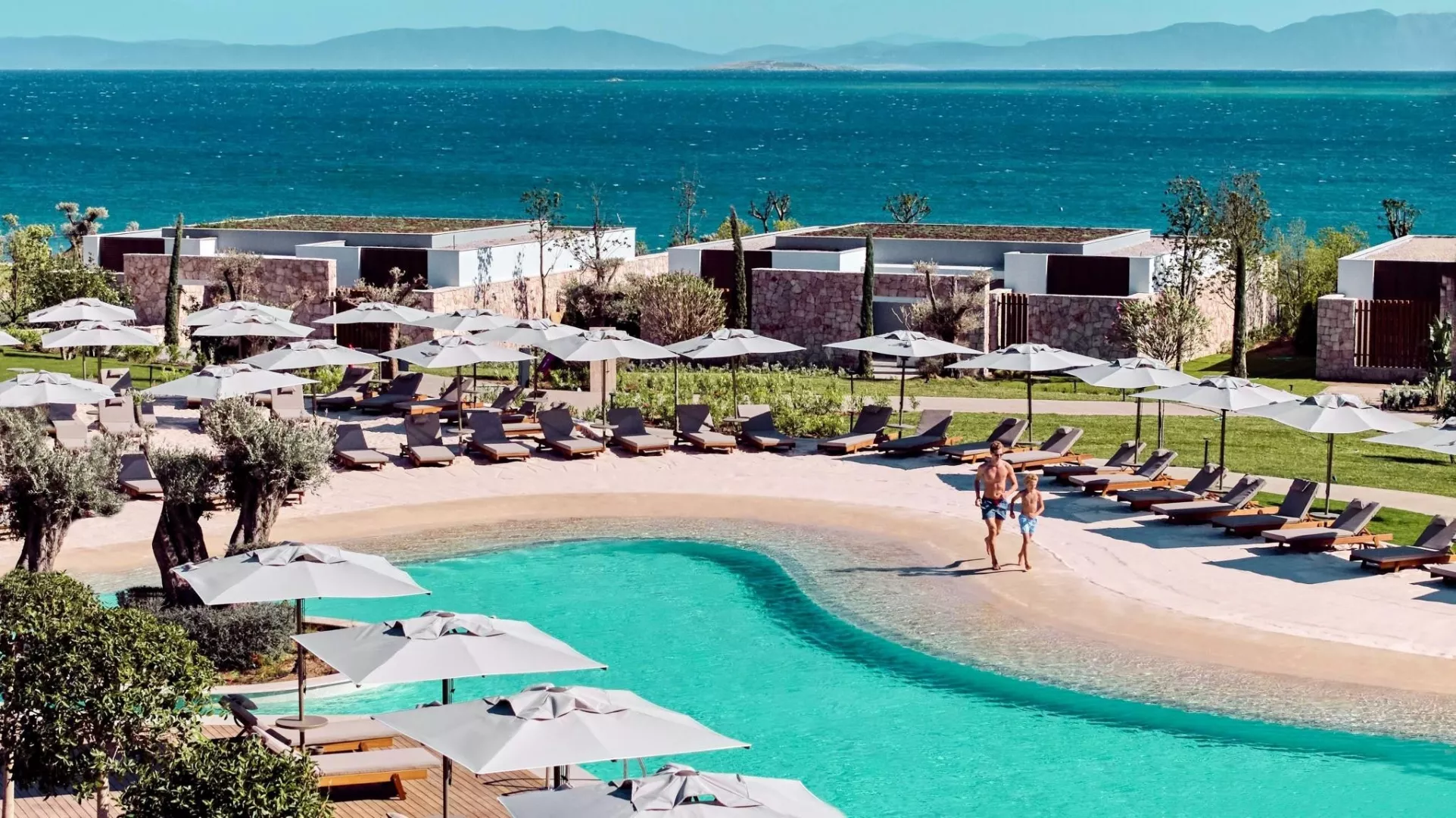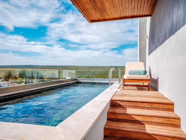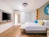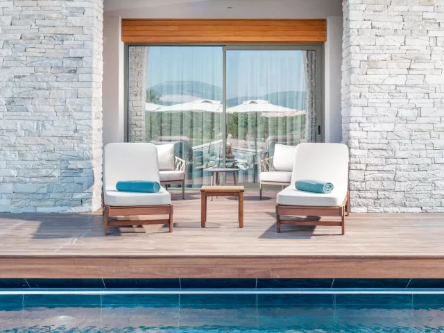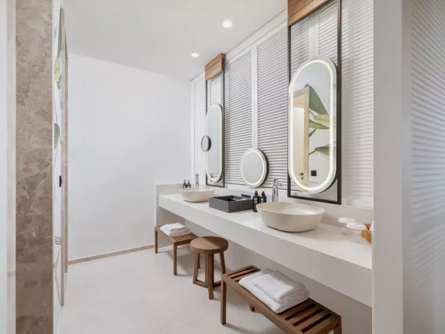 Dvojlôžková izba Deluxe v rodinnej zóne má plne vybavenú kúpeľňu, super king posteľ, klimatizáciu, minibar a balkón alebo terasu. Izby sú rozdelené podľa typu a výhľadu, vrátane možností so vstupom do vyhrievaného bazéna a rodinnej Suite Deluxe s dvoma samostatnými spálňami. Zóna pre dospelých ponúka izby s výhľadom na more a súkromnými bazénmi.