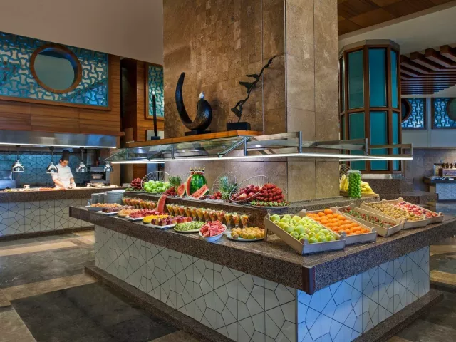Ultra all inclusive zahŕňa raňajky (7:00-11:00), obedy (12:30-14:30) a večere formou bufetu (19:00-21:30), ako aj popoludňajšie občerstvenie, kávu, čaj, zákusky a nočné občerstvenie. K dispozícii sú nealkoholické a alkoholické nápoje miestnej výroby v čase a na miestach určených hotelom.