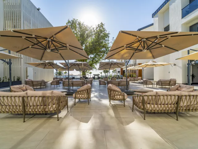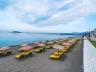 Hotel sa nachádza priamo pri piesočnato-kamienkovej pláži s pozvoľným vstupom do mora, oddelenej miestnou promenádou. K dispozícii je súkromná časť hotelovej pláže, ležadlá, slnečníky a osušky sú zadarmo.