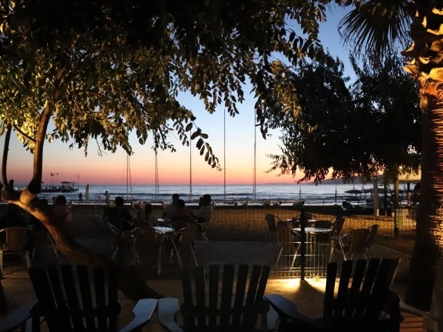 Piesočnatá pláž ponúka ležadlá, slnečníky a matrace zdarma, pričom osušky sú na vratnú kauciu. Na pláži sa nachádza aj bar.