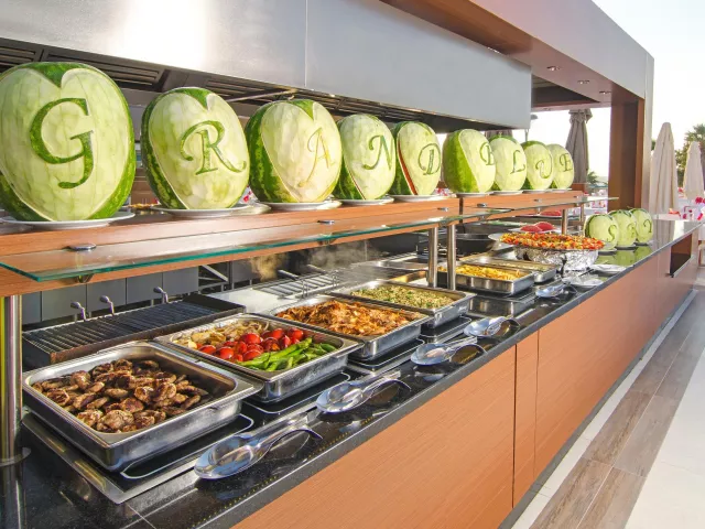 Služby sú poskytované v rámci Ultra All inclusive, čo zahŕňa raňajky, obedy a večere formou bufetu. K dispozícii sú aj 3 à la carte reštaurácie s možnosťou výberu z menu (1x za pobyt zdarma, nutná rezervácia pri príchode) a neobmedzené množstvo nealkoholických a alkoholických nápojov miestnej výroby a vybraných importovaných (24 h). Dôležité je, že hotel určuje časy a miesta podávania jedál a tieto sa môžu zmeniť.