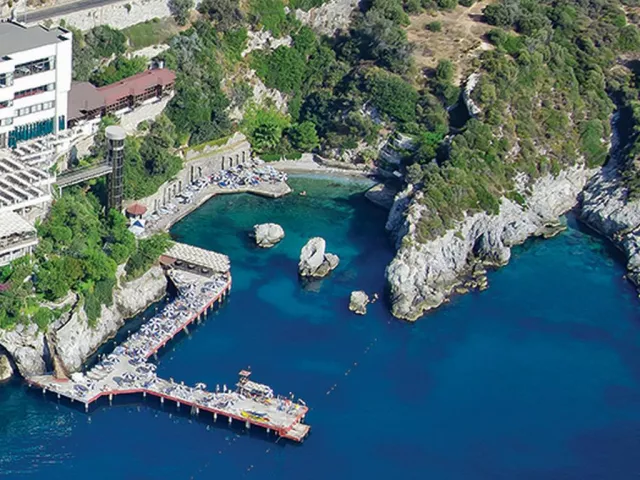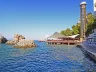 Pohodlná pieskovo-kamienková pláž je prístupná po schodoch alebo výťahom s bezplatným plážovým servisom. Na pláži sa nachádza mólo a plážový bar.