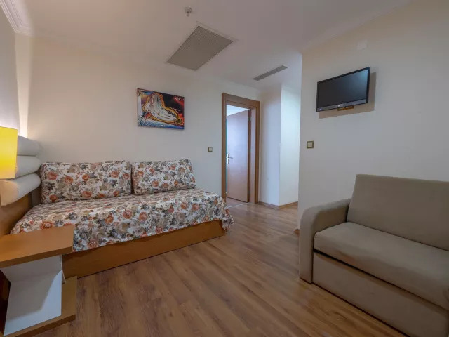 Dvojlôžková izba s čiastočným výhľadom na more je vybavená individuálne ovládanou klimatizáciou, TV so satelitným príjmom, telefónom, minibarom (denne 1,5 l fľaša vody), setom na prípravu čaju a kávy, vlastným sociálnym zariadením (kúpeľňa, WC, sušič vlasov) a trezorom (zadarmo). Izba disponuje tiež prístelkou vo forme rozkladacieho kresla a balkónom. Rodinné izby obsahujú 2 spálne s čiastočným výhľadom na more a sú rozdelené dverami.