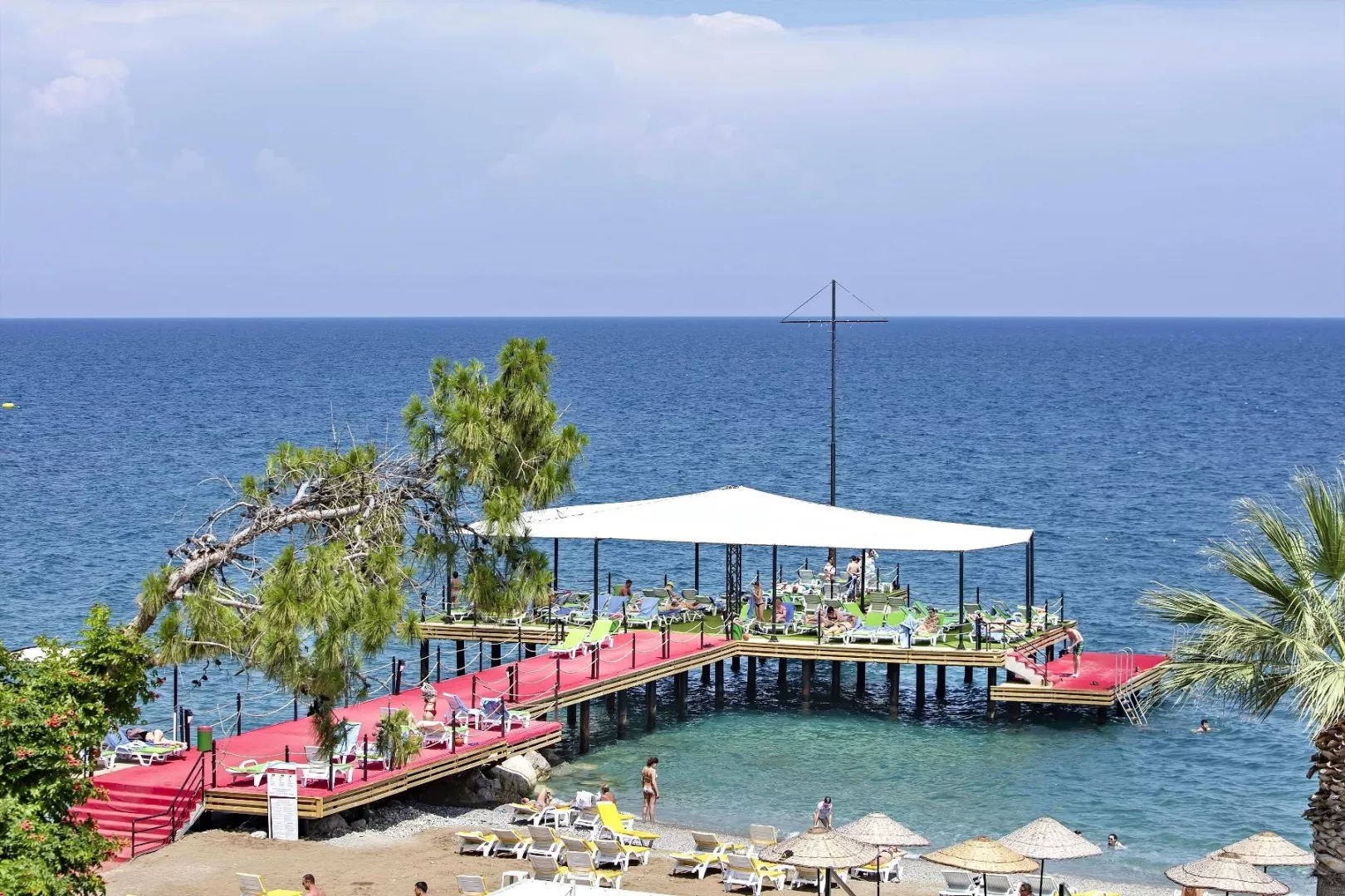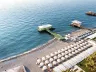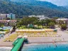 Piesočná pláž s okruhliakmi priamo pri hoteli (areál hotela preťatý úzkou miestnou komunikáciou). Lehátka, slnečníky a osušky zadarmo. Bar na pláži